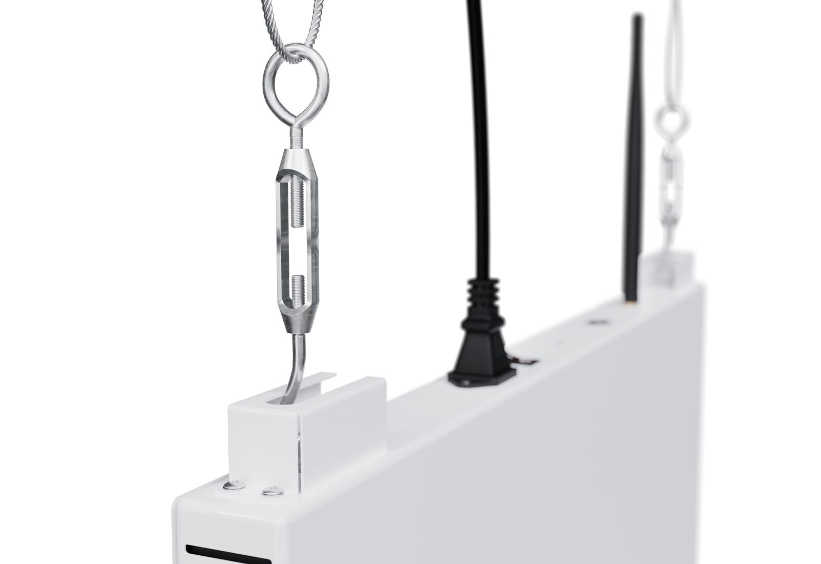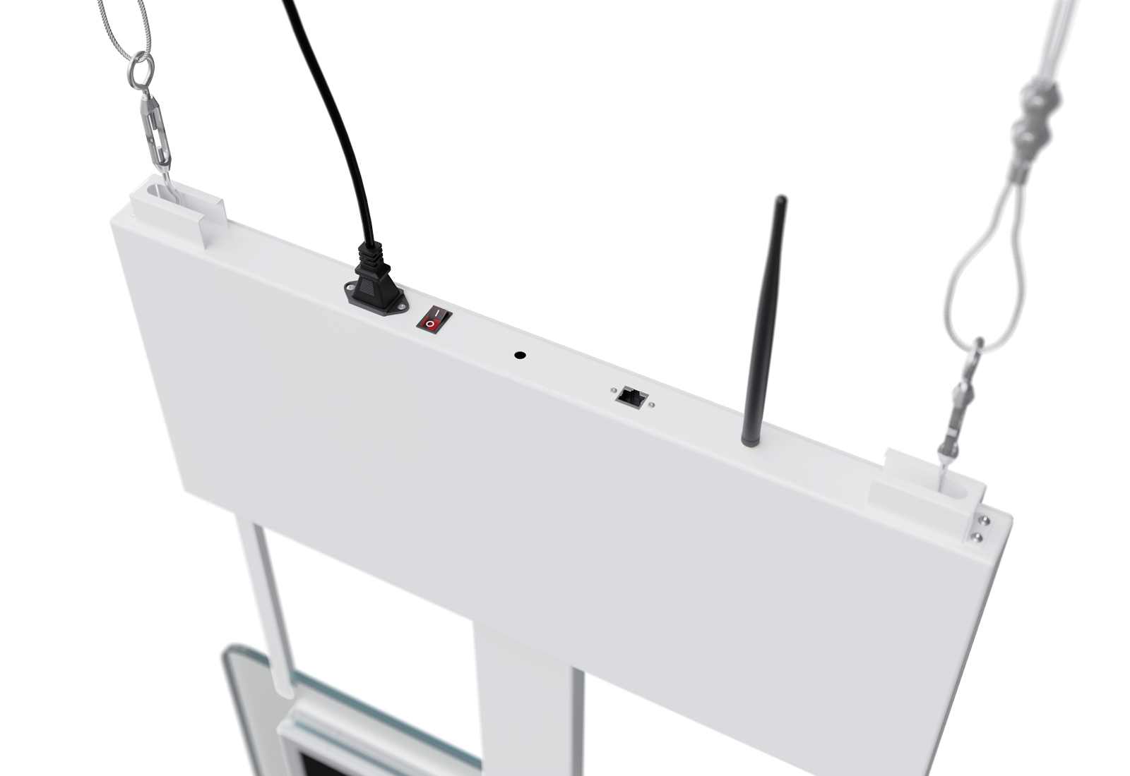 Le tableau d'affichage numérique est tout simplement fixé au plafond et peut donc être utilisé dans les endroits les plus divers. Il est important que le plafond soit conçu pour supporter le poids et dispose d'une résistance adéquate. Des câbles en acier et des boulons discrets permettent de fixer votre tableau d'affichage suspendu au plafond en toute sécurité. Tout le matériel de montage est compris dans la livraison.