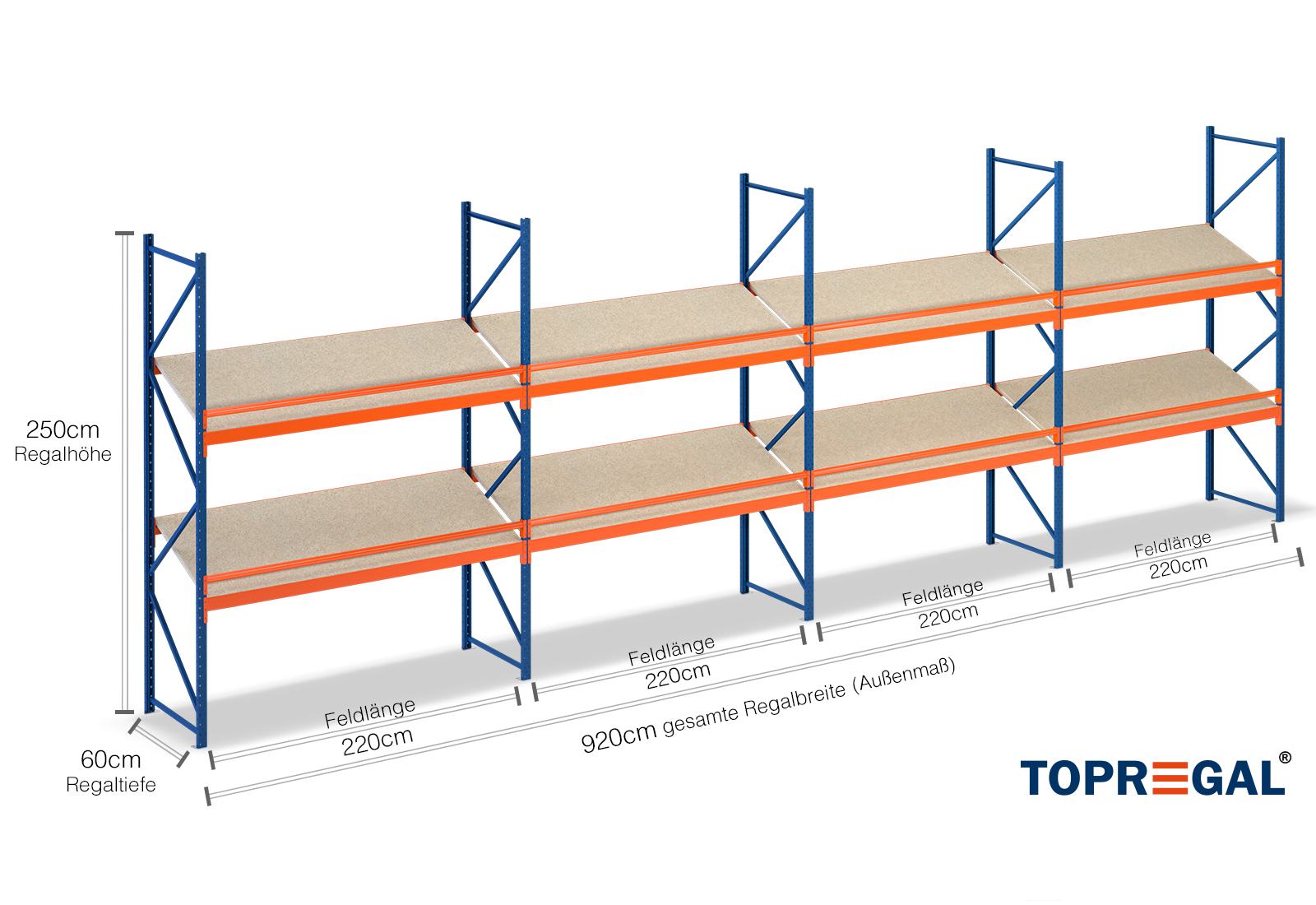 Toutes les données se réfèrent à des charges uniformément réparties. En cas de chargement, la charge par plateau et la charge par travée ne doivent pas être dépassées. En principe, les directives actuelles sur la sécurité et la santé au travail s'appliquent lors de l'utilisation (Règle DGUV allemande 208-061). TOPREGAL décline toute responsabilité en cas d'accidents/dommages dus à une utilisation non conforme. Notre équipe de conseillers spécialisés répondra à vos questions à ce sujet. Les dimensions indiquées sont approximatives et peuvent varier de quelques centimètres. Contactez-nous si vous avez besoin des dimensions exactes du produit que vous souhaitez acheter.