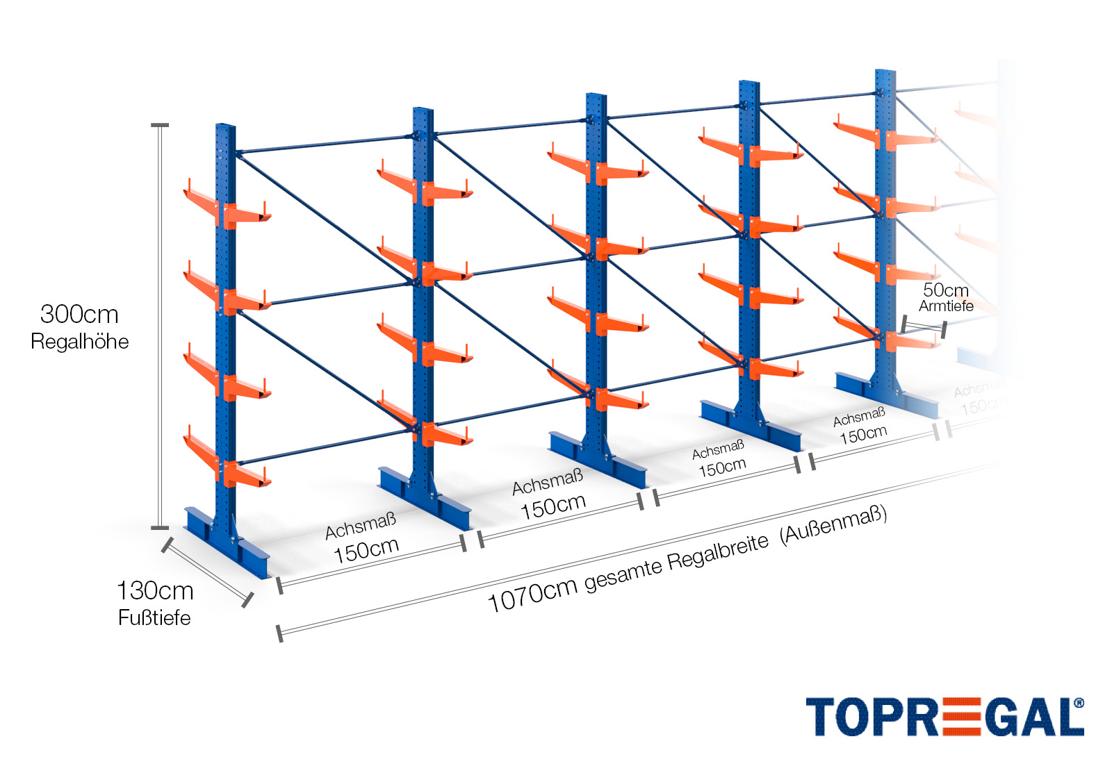 10,7 m rayonnage cantilever KR3000 / Peint / Bilatéral / hauteur 3 m / cantilever profondeur 50 cm / 4 niveaux