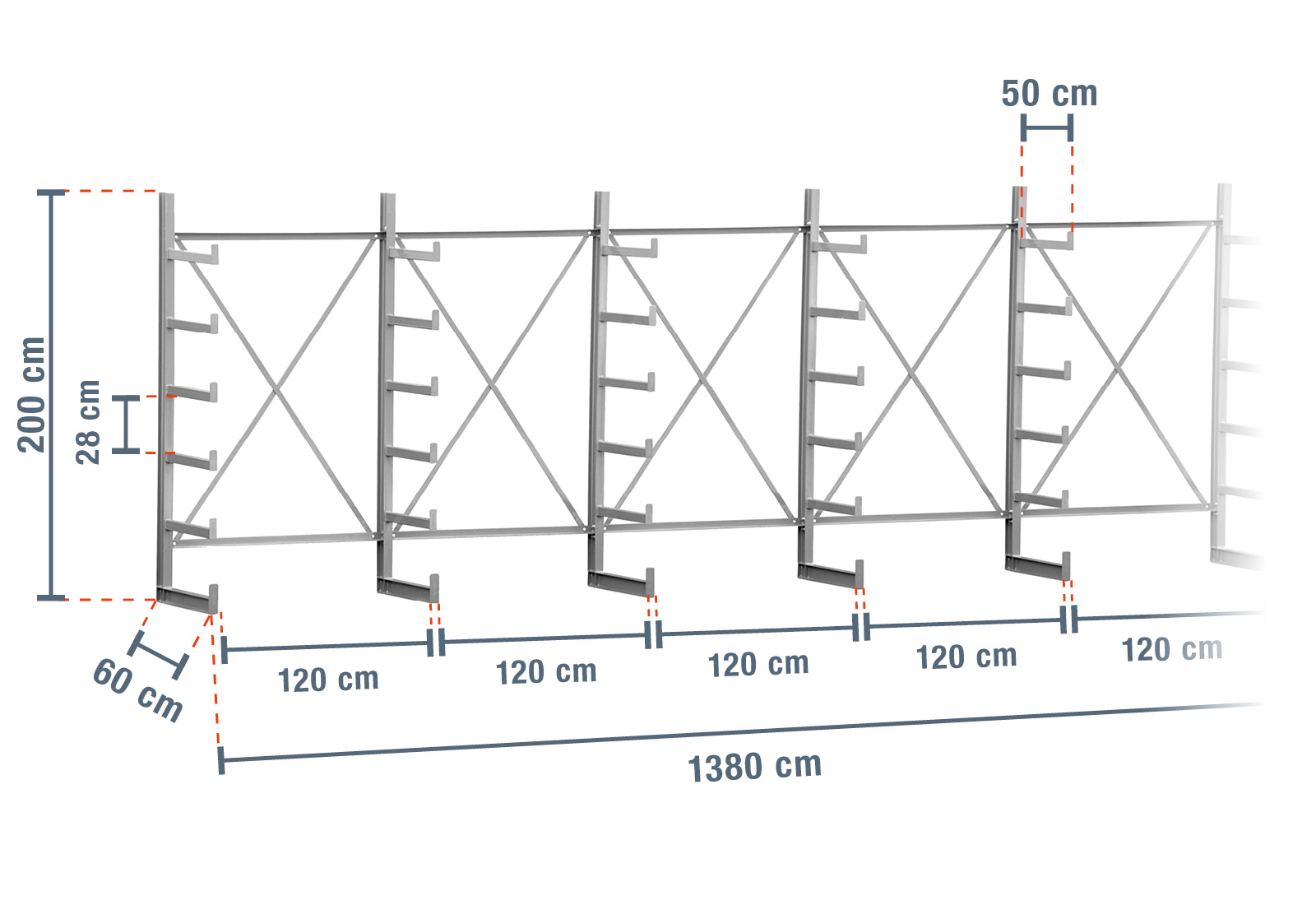 Ce rack cantilever particulièrement robuste de 13,8 m de large et 2 m de haut possède 5 niveaux avec une profondeur de bras de 50 cm. Avec le modèle simple face doté de cantilevers déjà soudés, chaque montant peut supporter une charge maximale de 1.250 kg, chaque bras offrant une capacité de charge maximale de 250 kg.