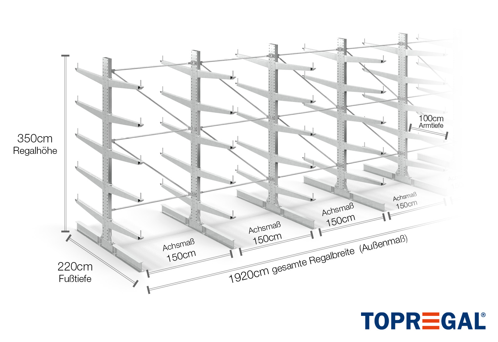 La dimension axiale est la dimension interne entre deux montants d'étagère. Selon le type de cantilever, nous proposons ces champs en 120 cm (KR2500) et en 100 cm / 150 cm (KR3000 / KR6000).