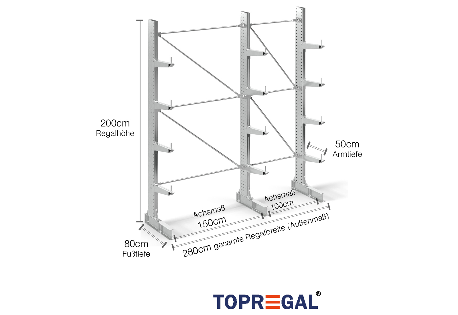 2,8 m rayonnage cantilever KR3000 / Galvanisé à chaud / Unilatéral / hauteur 2 m / 50 cm cantilever profondeur / 4 niveaux