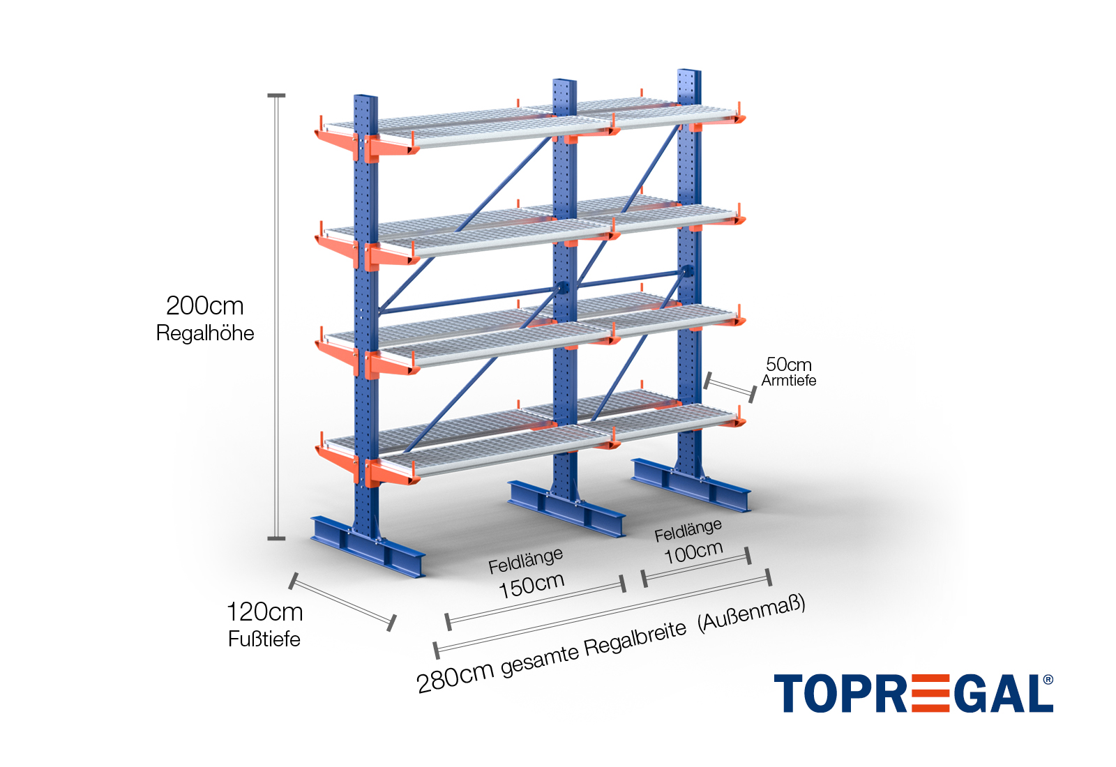 2,8 m rayonnage cantilever KR3000 / Peint / Bilatéral / hauteur 2 m / 50 cm cantilever profondeur / 4 niveaux / platelage Grillage