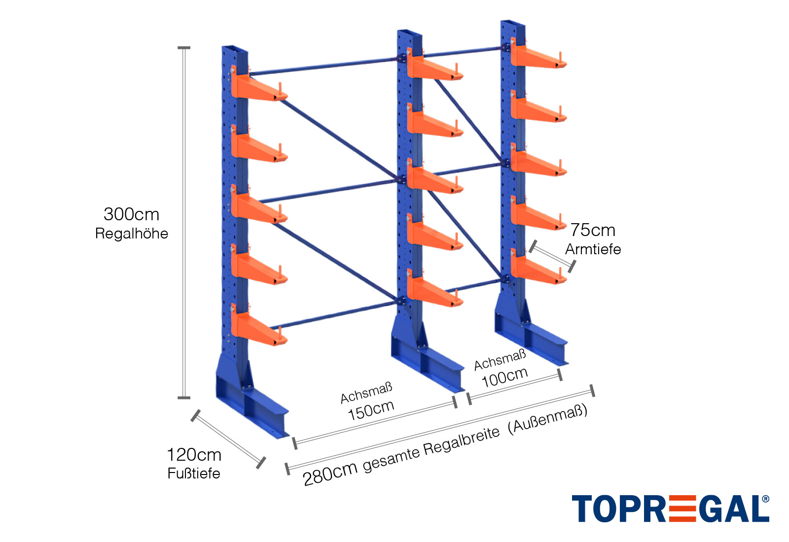 2,8 m rayonnage cantilever KR6000 / Peint / Unilatéral / hauteur 3 m / 75 cm cantilever profondeur / 5 niveaux