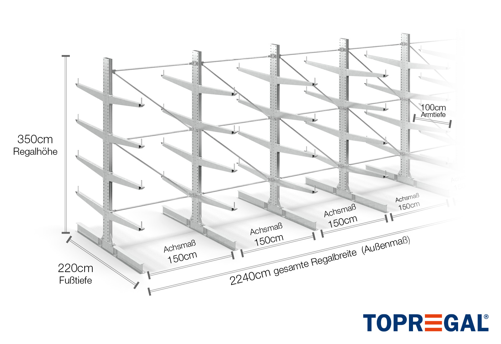 La dimension axiale est la dimension interne entre deux montants d'étagère. Selon le type de cantilever, nous proposons ces champs en 120 cm (KR2500) et en 100 cm / 150 cm (KR3000 / KR6000).
