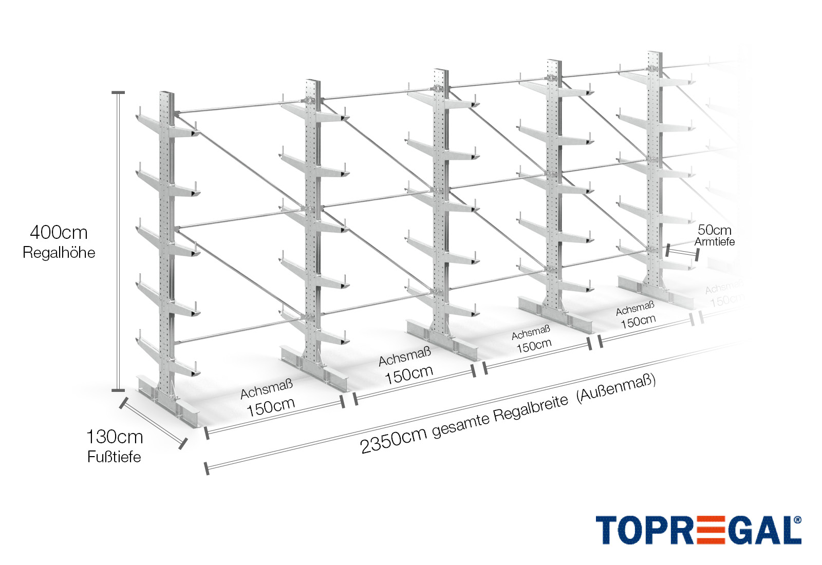 La dimension axiale est la dimension interne entre deux montants d'étagère. Selon le type de cantilever, nous proposons ces champs en 120 cm (KR2500) et en 100 cm / 150 cm (KR3000 / KR6000).