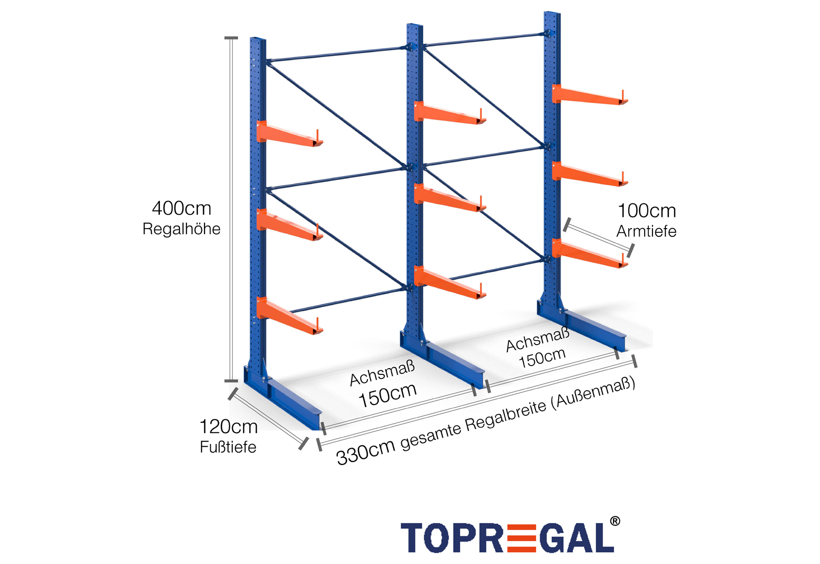 3,3 m rayonnage cantilever KR3000 / Peint / Unilatéral / 100 cm cantilever profondeur / hauteur 4 m / 3 niveaux