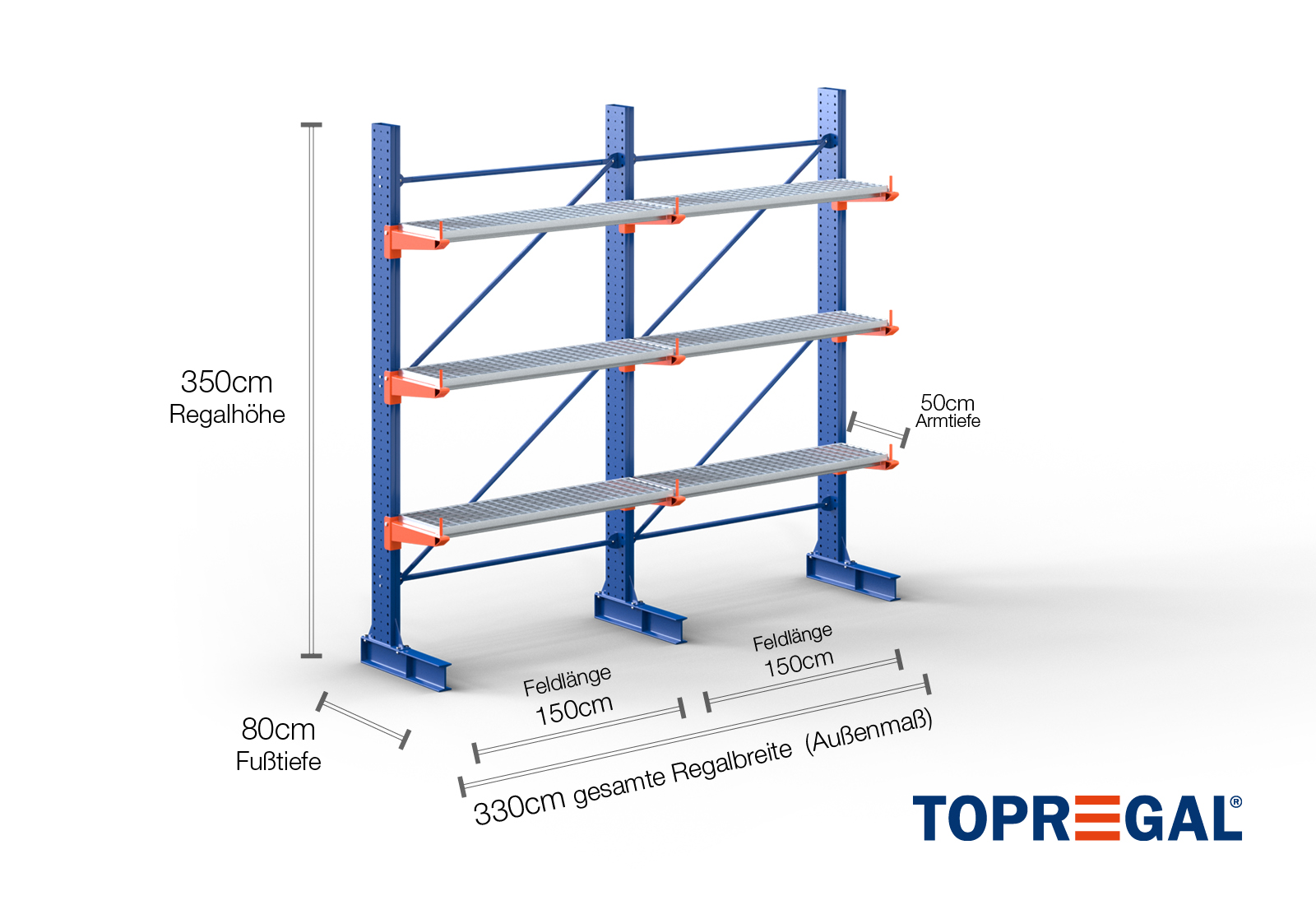 3,3 m rayonnage cantilever KR3000 / Peint / Unilatéral / hauteur 3,5 m / 3 niveaux / 50 cm cantilever profondeur / platelage Grillage