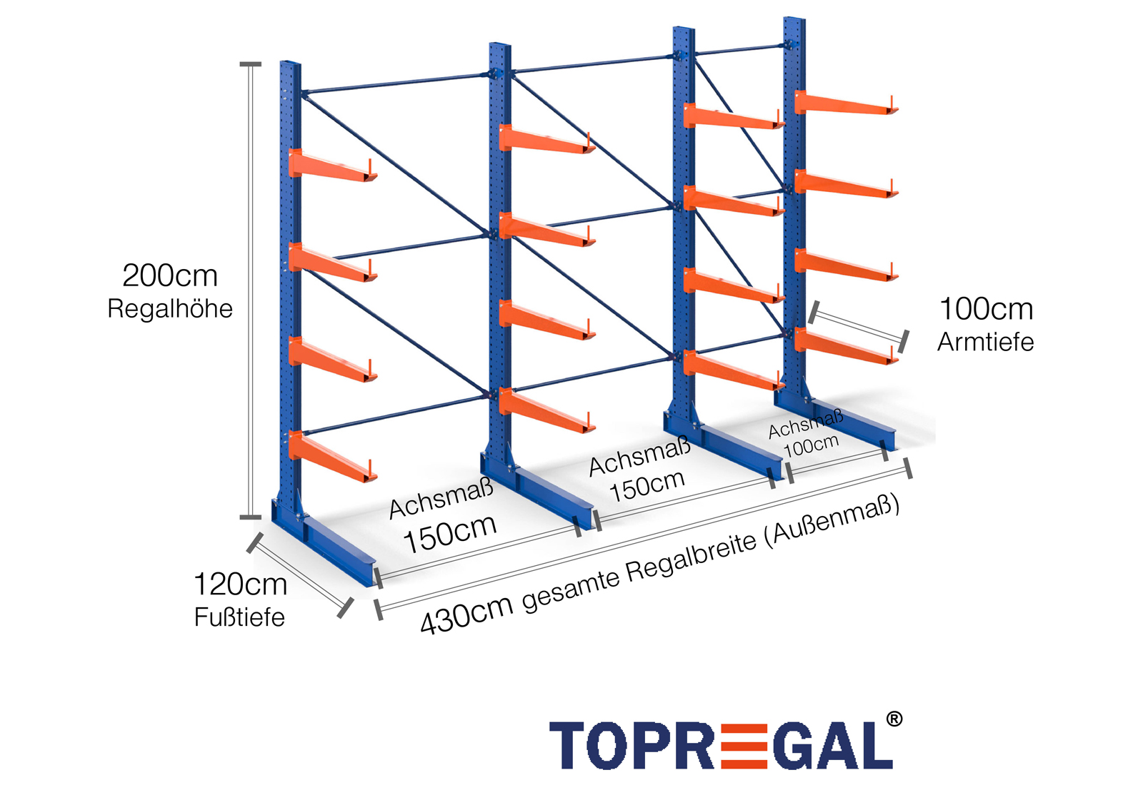 4,3 m rayonnage cantilever KR3000 / Peint / Unilatéral / 100 cm cantilever profondeur / hauteur 2 m / 4 niveaux