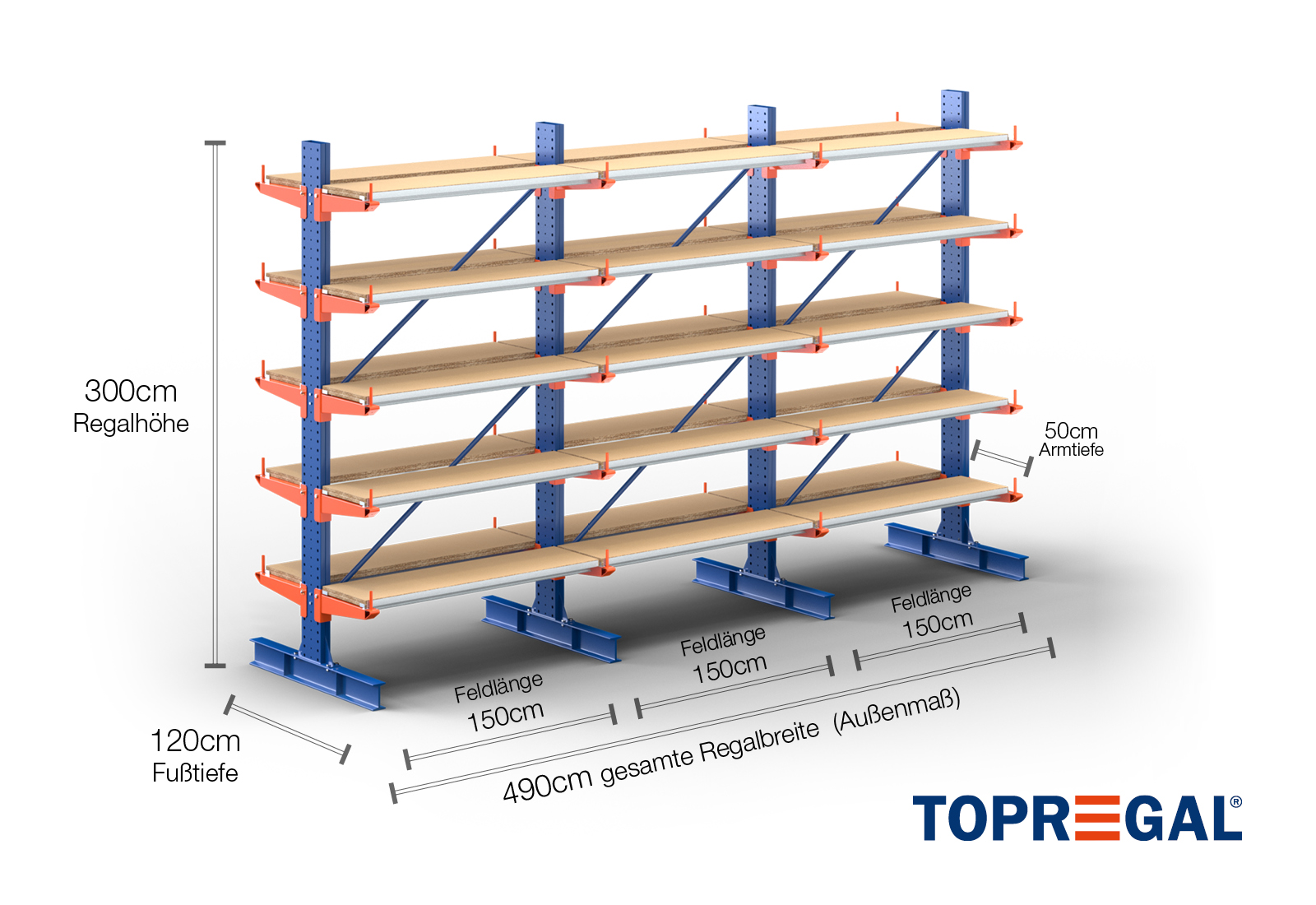 Ce rack cantilever en version double face d’une largeur de 4,9 m a une hauteur de 3 m, une profondeur totale de 120 cm et dispose de 5 niveaux de cantilevers d’une profondeur de 50 cm. La charge maximale par bras s’élève à 500 kg au maximum. Les cantilevers peuvent être accrochés individuellement dans une trame de 50 mm et sont fixés avec des boulons et goupilles de sécurité. Les pieds peuvent également être utilisés comme niveaux de stockage (selon les marchandises). Pour empêcher la charge de glisser accidentellement, une butée de sécurité peut être enfichée à l’extrémité de chaque cantilever. Cette butée est incluse par défaut dans la livraison.