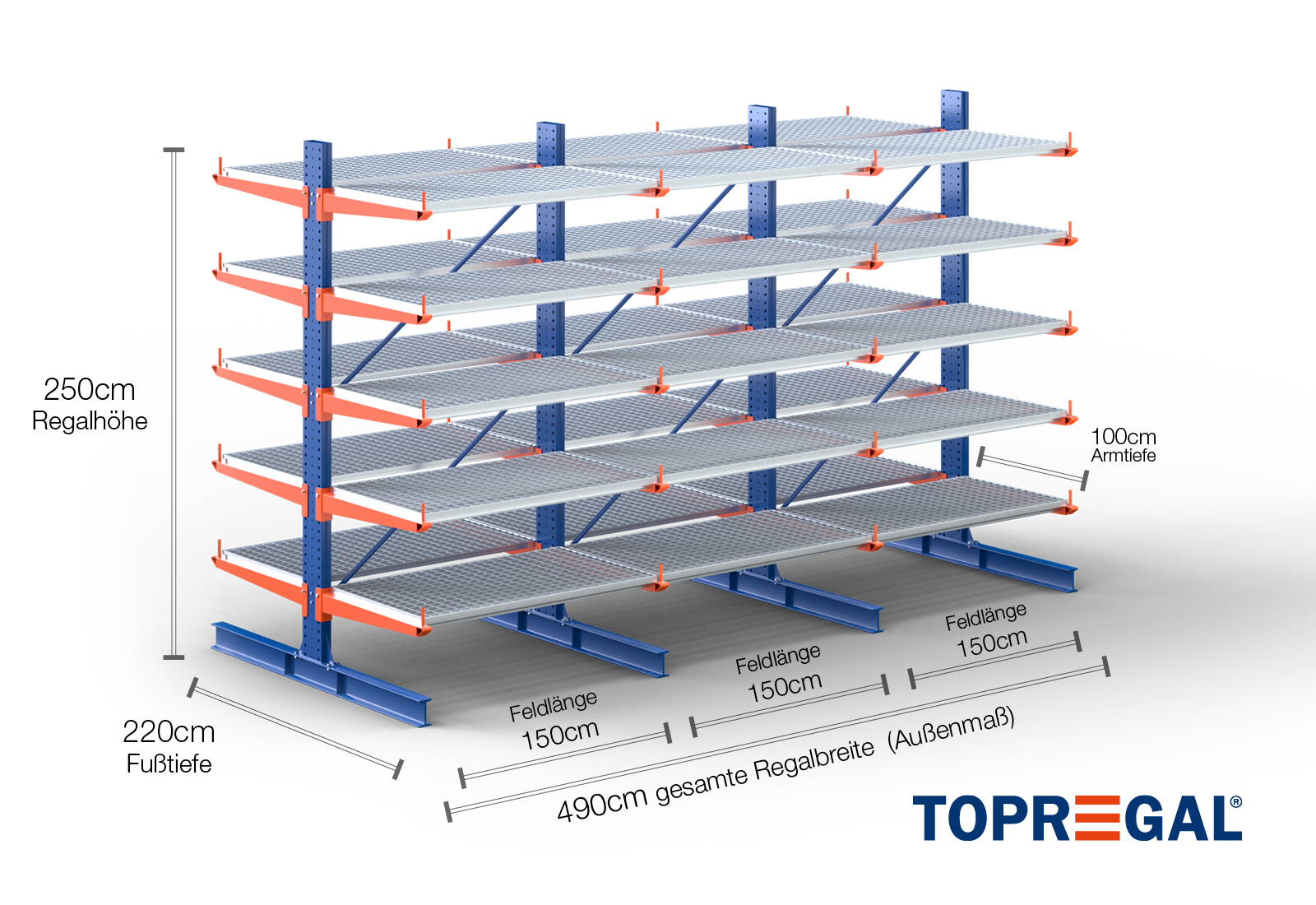 Ce rack cantilever en version double face d’une largeur de 4,9 m a une hauteur de 2,5 m, une profondeur totale de 220 cm et dispose de 5 niveaux de cantilevers d’une profondeur de 100 cm. La charge maximale par bras s’élève à 500 kg au maximum. Les cantilevers peuvent être accrochés individuellement dans une trame de 50 mm et sont fixés avec des boulons et goupilles de sécurité. Les pieds peuvent également être utilisés comme niveaux de stockage (selon les marchandises). Pour empêcher la charge de glisser accidentellement, une butée de sécurité peut être enfichée à l’extrémité de chaque cantilever. Cette butée est incluse par défaut dans la livraison.