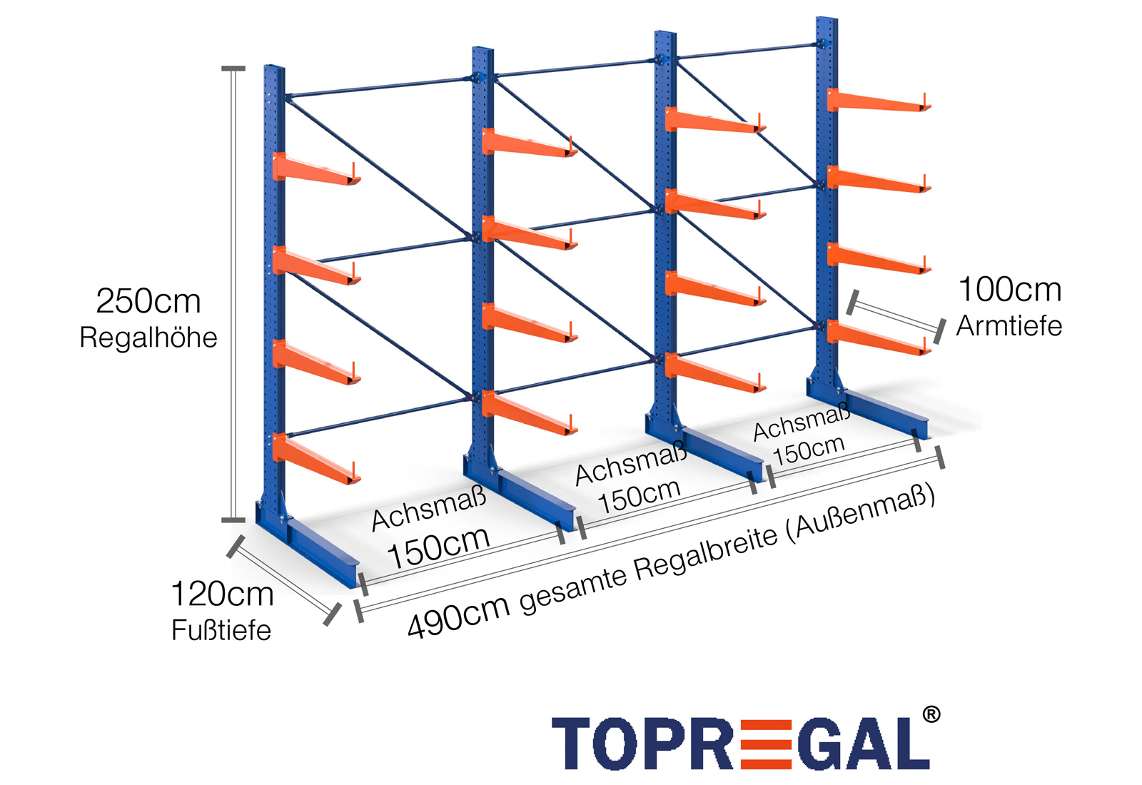 4,9 m rayonnage cantilever KR3000 / Peint / Unilatéral / 100 cm cantilever profondeur / hauteur 2,5 m / 4 niveaux