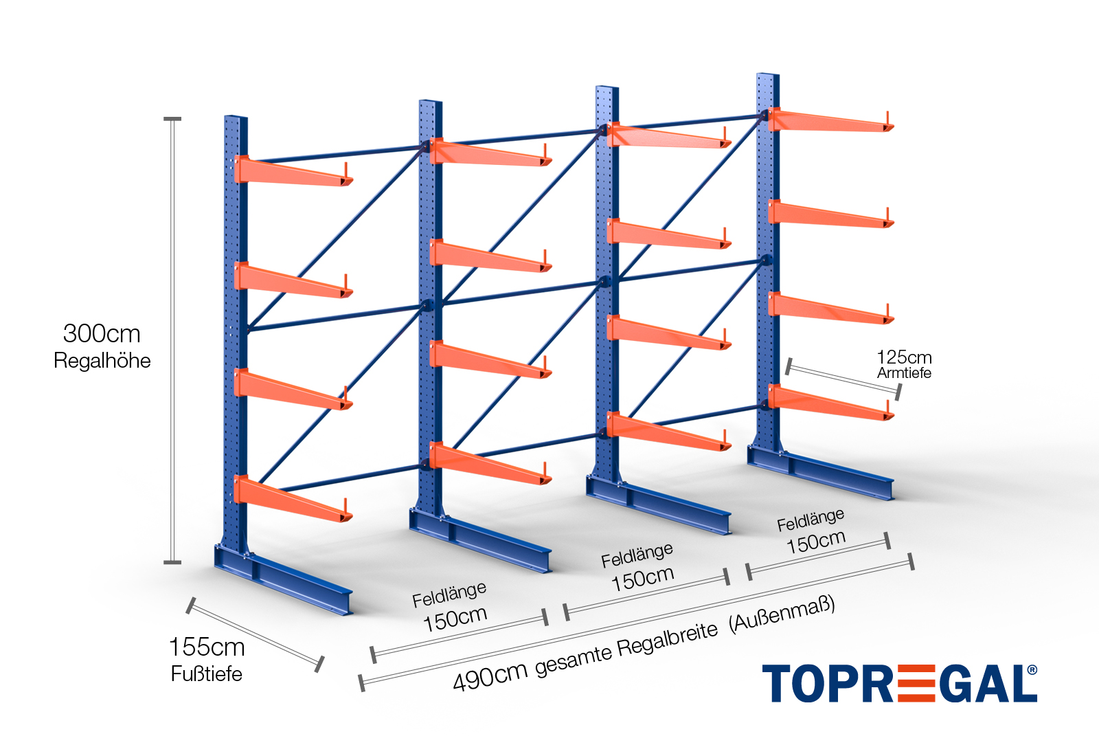 4,9 m rayonnage cantilever KR3000 / Peint / Unilatéral / 125 cm cantilever profondeur / hauteur 3 m / 4 niveaux