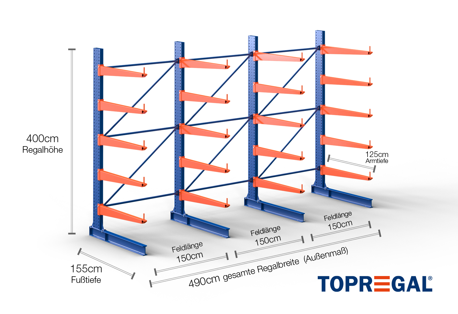 4,9 m rayonnage cantilever KR3000 / Peint / Unilatéral / 125 cm cantilever profondeur / hauteur 4 m / 5 niveaux