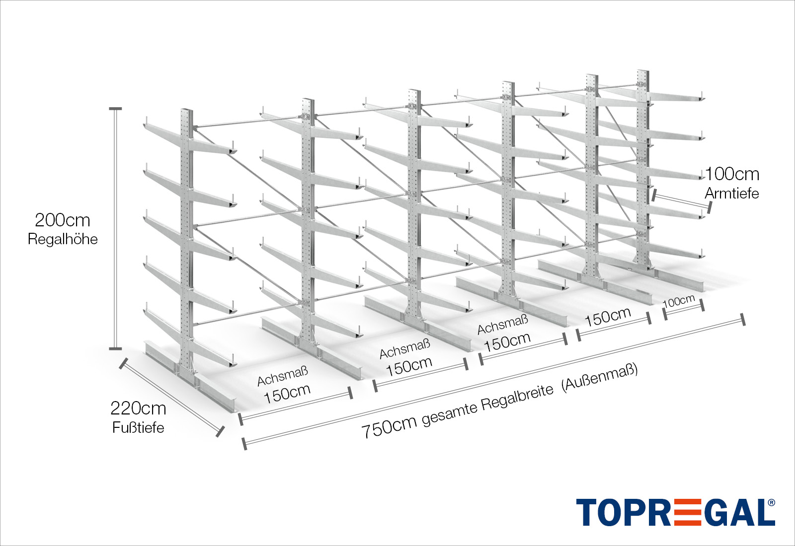 7,5 m rayonnage cantilever KR3000 / Galvanisé à chaud / Bilatéral / 2 m hauteur / 100 cm cantilever profondeur / 5 niveaux