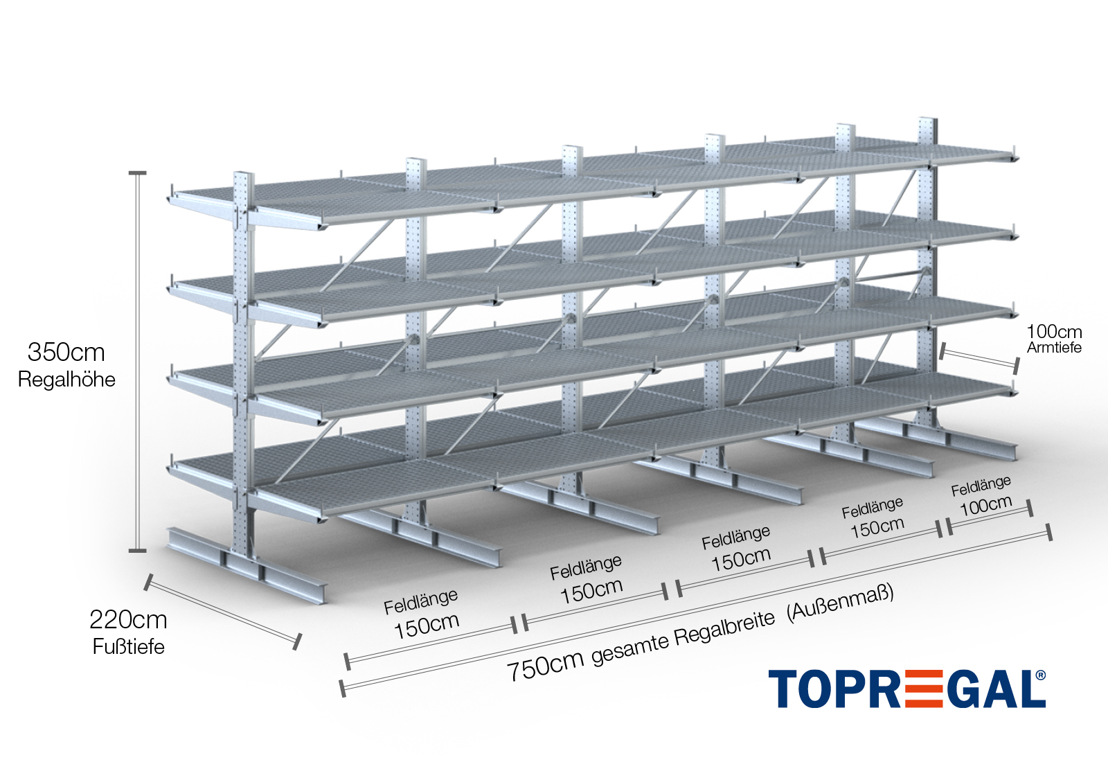 7,5 m rayonnage cantilever KR3000 / Galvanisé à chaud / Bilatéral / 3,5 m hauteur / 100 cm cantilever profondeur / 4 niveaux / platelage Grillage