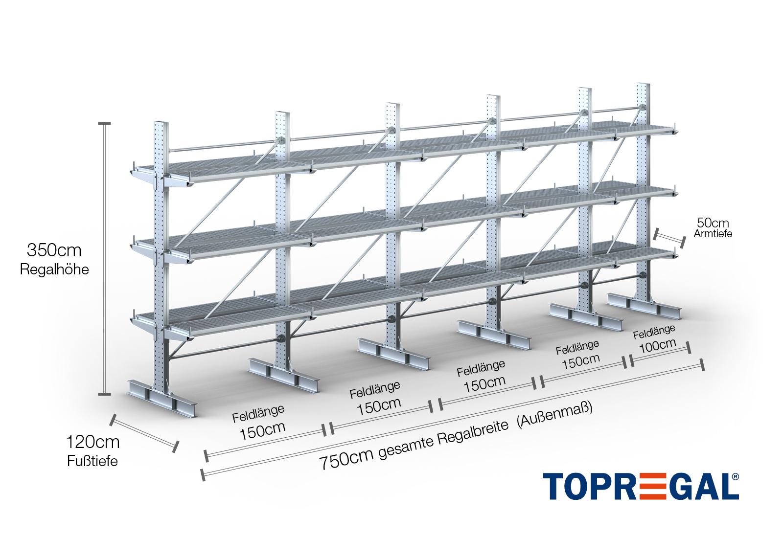 La dimension axiale est la dimension interne entre deux montants d'étagère. Selon le type de cantilever, nous proposons ces champs en 120 cm (KR2500) et en 100 cm / 150 cm (KR3000 / KR6000).