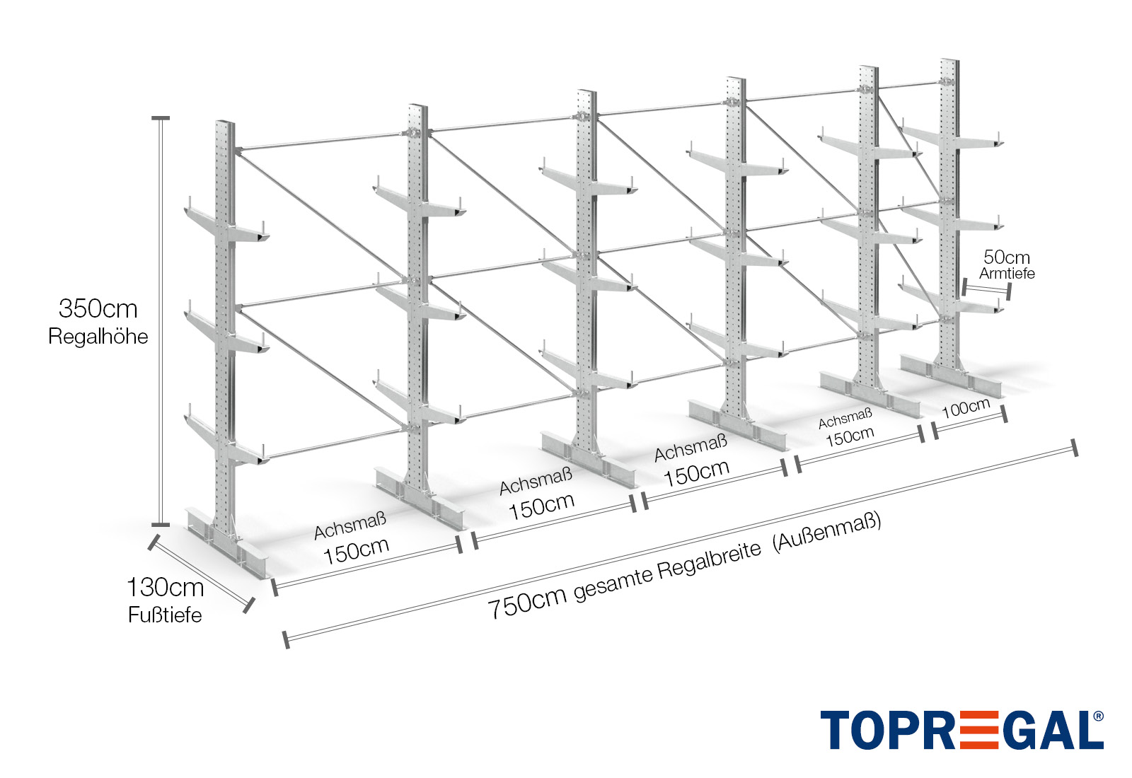 La dimension axiale est la dimension interne entre deux montants d'étagère. Selon le type de cantilever, nous proposons ces champs en 120 cm (KR2500) et en 100 cm / 150 cm (KR3000 / KR6000).