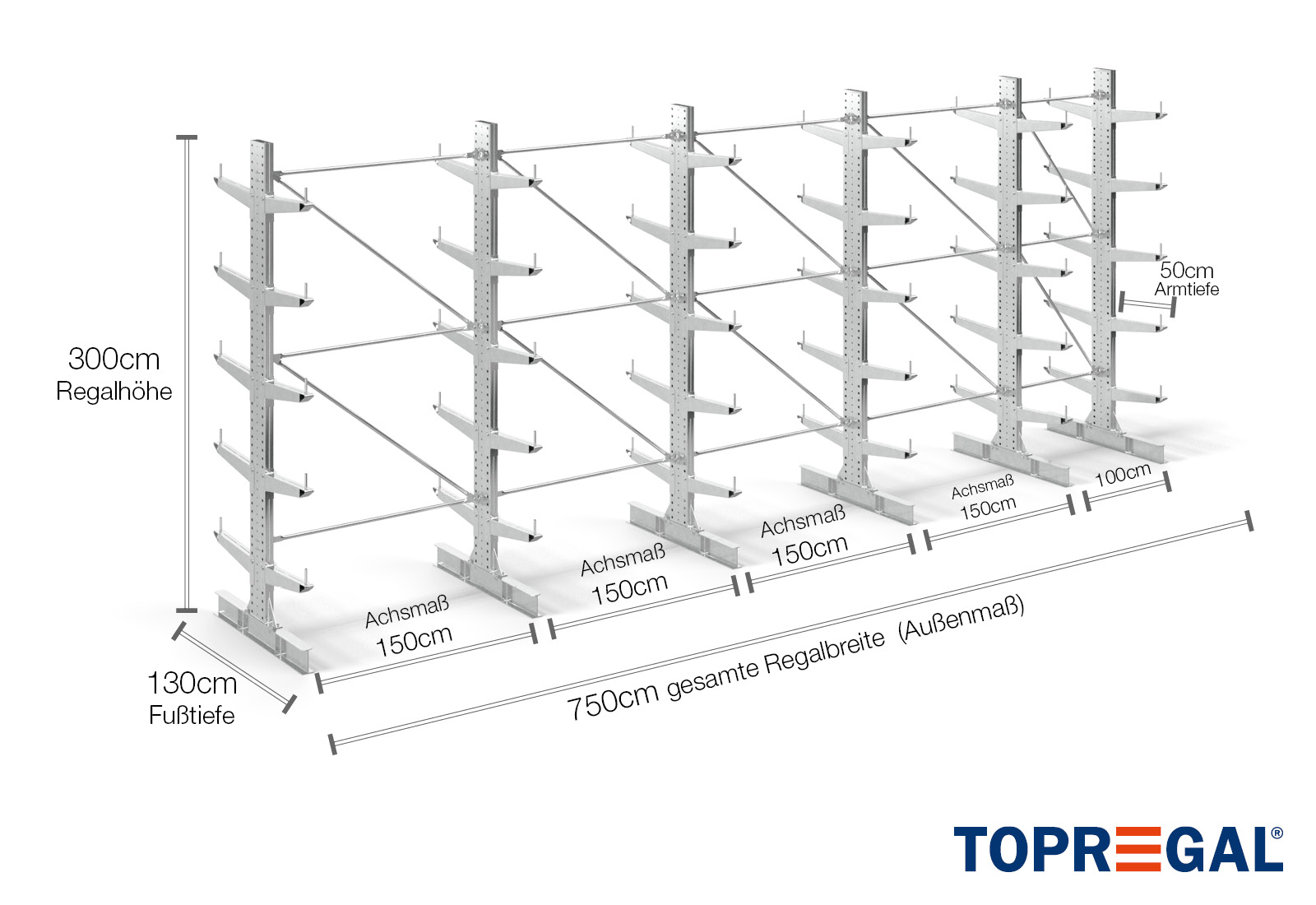 7,5 m rayonnage cantilever KR3000 / Galvanisé à chaud / Bilatéral / 3 m hauteur / 50 cm cantilever profondeur / 5 niveaux