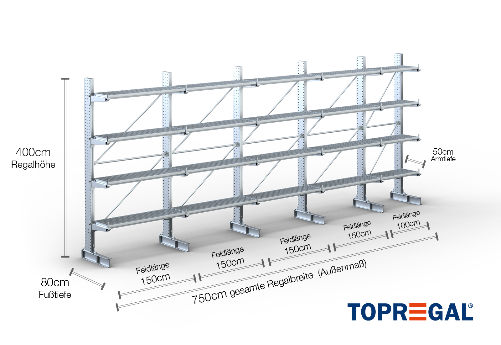 7,5 m rayonnage cantilever KR3000 / Galvanisé à chaud / Unilatéral / hauteur 4 m / 50 cm cantilever profondeur / 4 niveaux / platelage Grillage