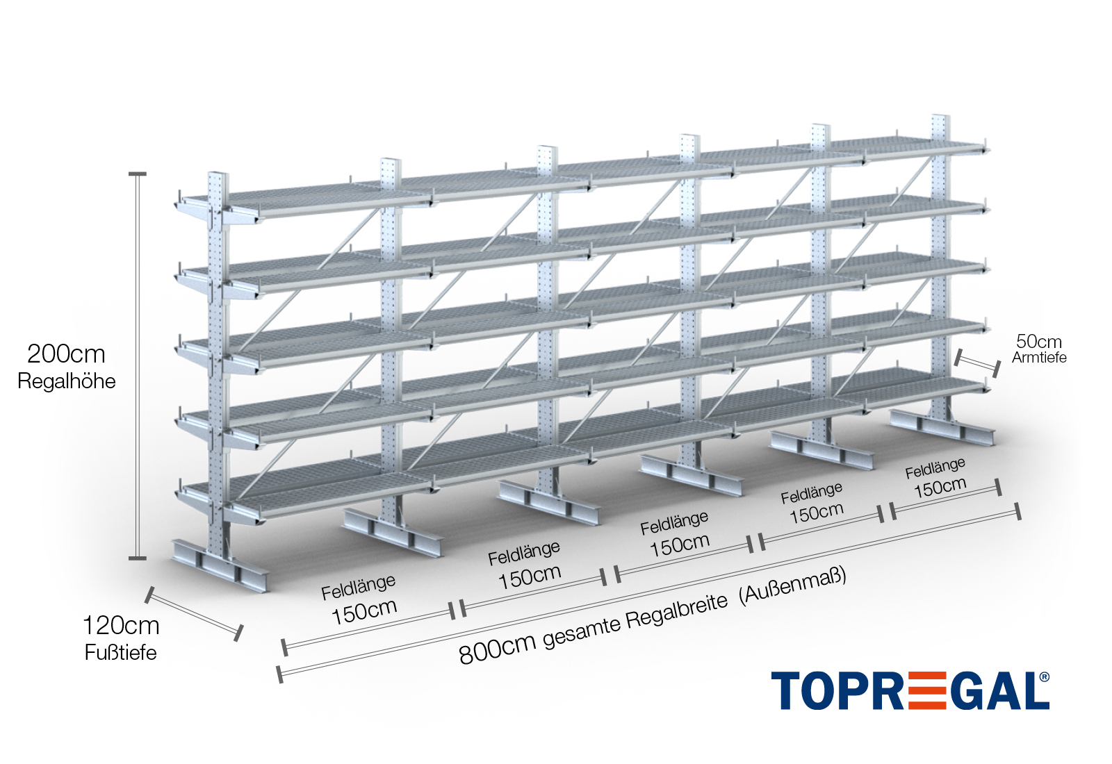 8 m rayonnage cantilever KR3000 / Galvanisé à chaud / Bilatéral / 2 m hauteur / 50 cm cantilever profondeur / 5 niveaux / platelage Grillage