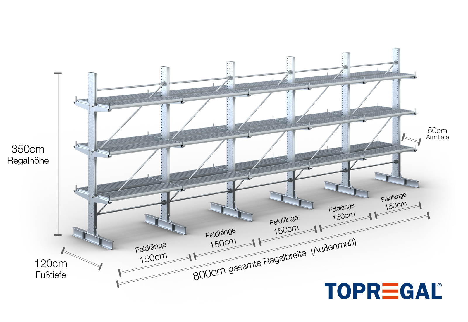 Ce rack cantilever en version double face d’une largeur de 8 m a une hauteur de 3,5 m, une profondeur totale de 120 cm et dispose de 3 niveaux de cantilevers d’une profondeur de 50 cm. La charge maximale par bras s’élève à 500 kg au maximum. Les cantilevers peuvent être accrochés individuellement dans une trame de 50 mm et sont fixés avec des boulons et goupilles de sécurité. Les pieds peuvent également être utilisés comme niveaux de stockage (selon les marchandises). Pour empêcher la charge de glisser accidentellement, une butée de sécurité peut être enfichée à l’extrémité de chaque cantilever. Cette butée est incluse par défaut dans la livraison.