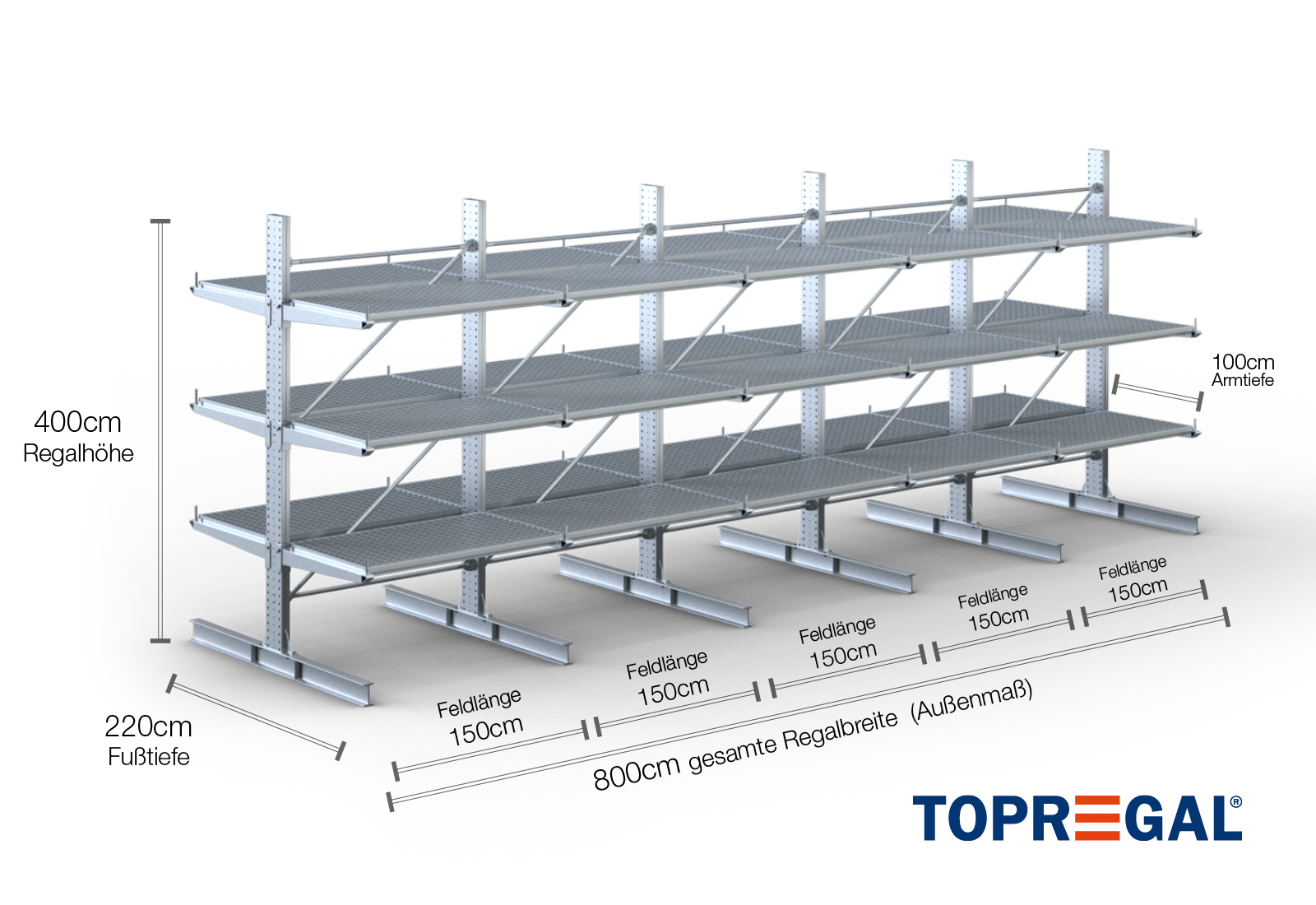 Ce rack cantilever en version double face d’une largeur de 8 m a une hauteur de 4 m, une profondeur totale de 220 cm et dispose de 3 niveaux de cantilevers d’une profondeur de 100 cm. La charge maximale par bras s’élève à 500 kg au maximum. Les cantilevers peuvent être accrochés individuellement dans une trame de 50 mm et sont fixés avec des boulons et goupilles de sécurité. Les pieds peuvent également être utilisés comme niveaux de stockage (selon les marchandises). Pour empêcher la charge de glisser accidentellement, une butée de sécurité peut être enfichée à l’extrémité de chaque cantilever. Cette butée est incluse par défaut dans la livraison.