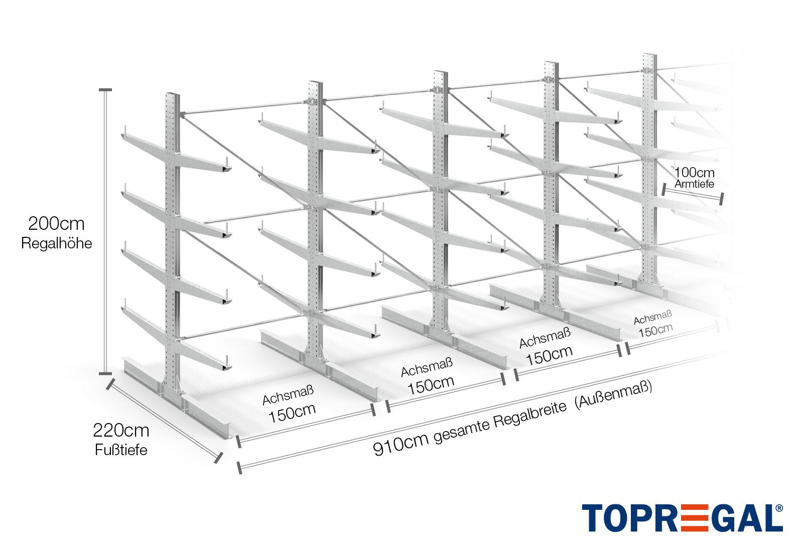 La dimension axiale est la dimension interne entre deux montants d'étagère. Selon le type de cantilever, nous proposons ces champs en 120 cm (KR2500) et en 100 cm / 150 cm (KR3000 / KR6000).