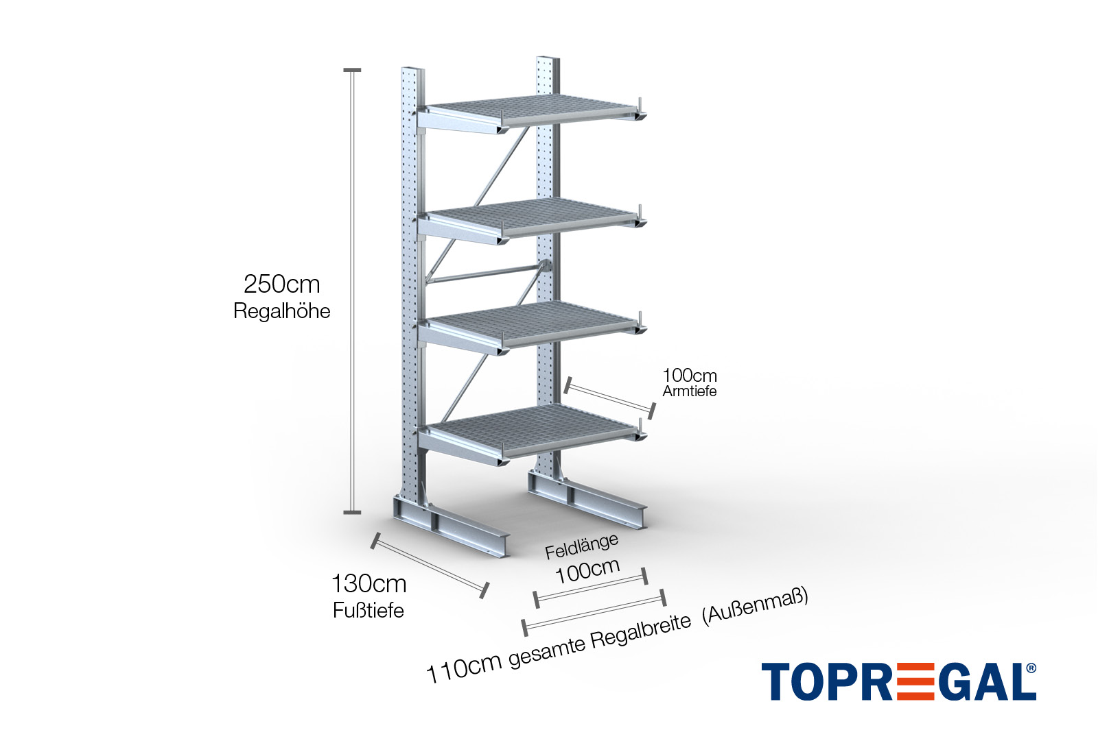 1,1 m rayonnage cantilever KR3000 / Galvanisé à chaud / Unilatéral / hauteur 2,5 m / 100 cm cantilever profondeur / 4 niveaux / platelage Grillage