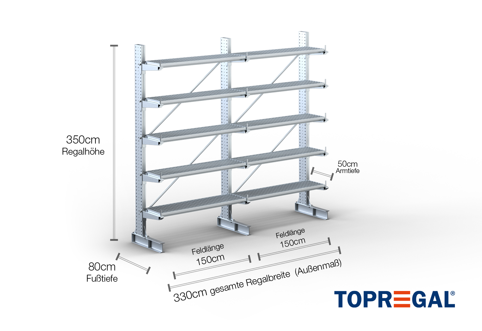 3,3 m rayonnage cantilever KR3000 / Galvanisé à chaud / Unilatéral / hauteur 3,5 m / 50 cm cantilever profondeur / 5 niveaux / platelage Grillage