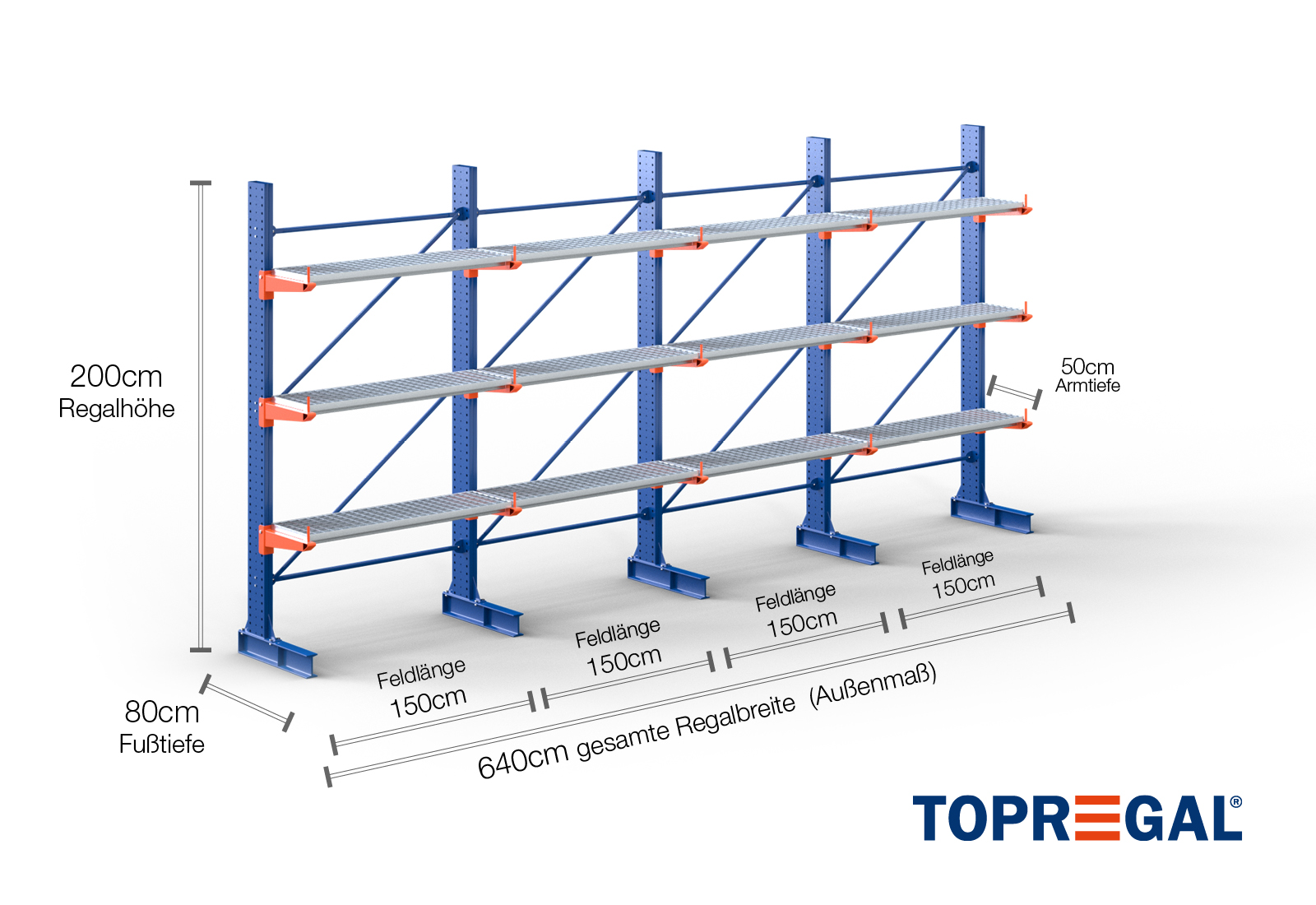 6,4 m rayonnage cantilever KR3000 / Peint / Unilatéral / hauteur 2 m / 3 niveaux / 50 cm cantilever profondeur / platelage Grillage