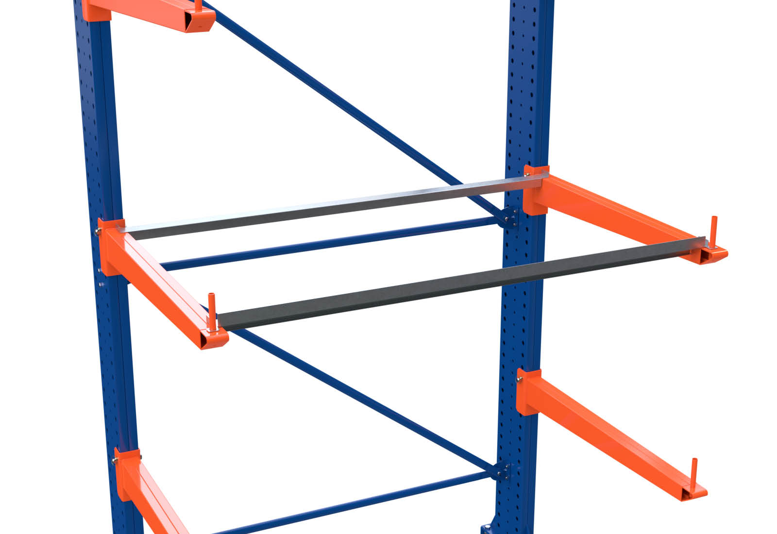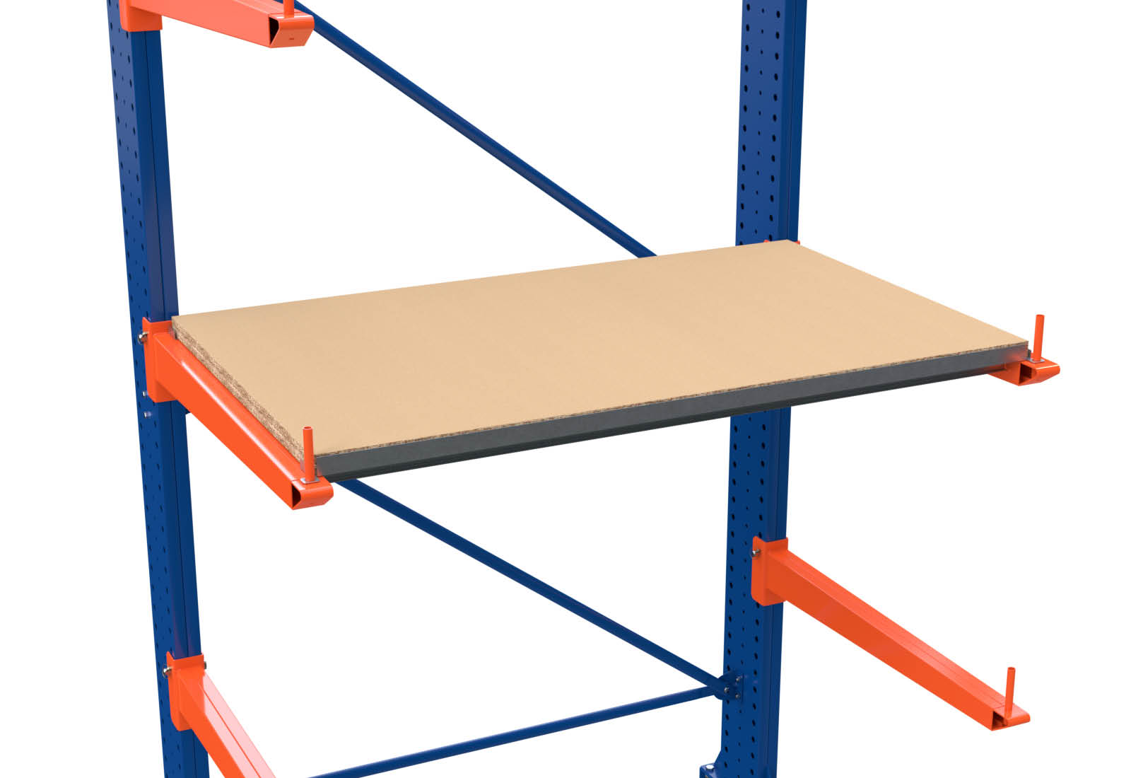 Le platelage permet de charger le rack entre autres avec des palettes, des paquets ou des boîtes de transport. Les tablettes servent aussi à éviter les chutes et protègent les marchandises longues entre les cantilevers contre toute flexion involontaire.