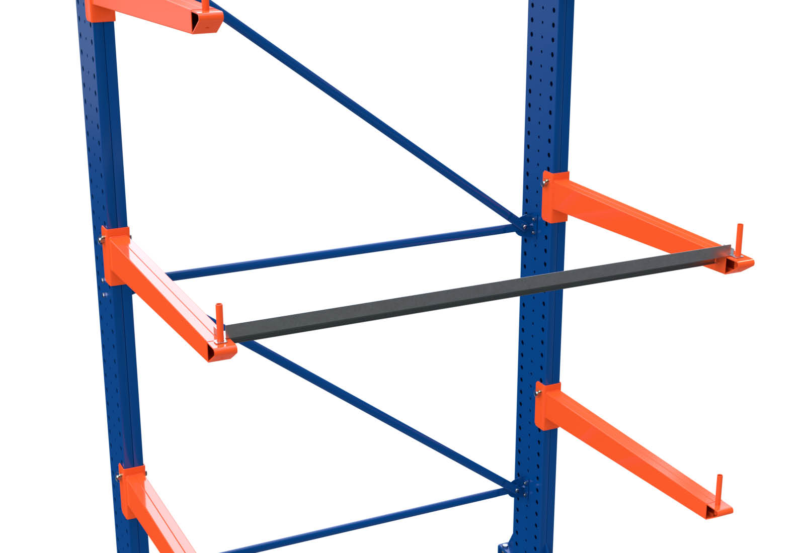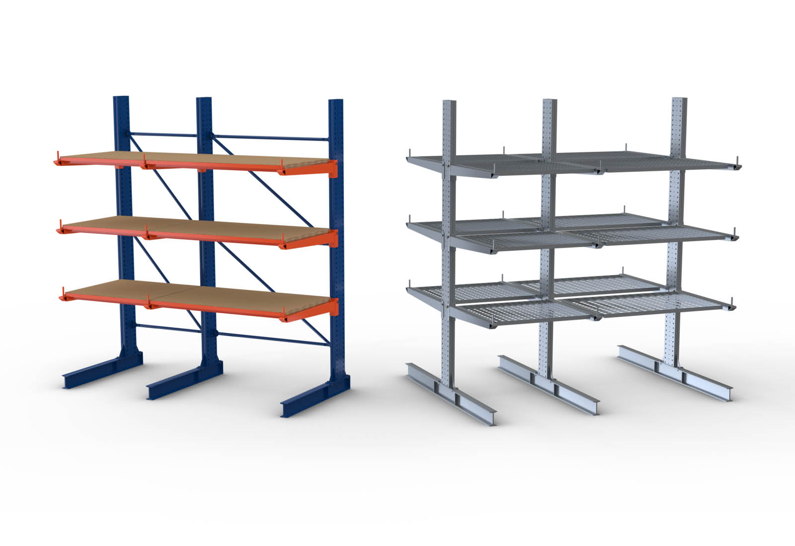 Le platelage permet de charger le rack entre autres avec des palettes, des seaux remplis de liquides, des fûts, des paquets ou des boîtes de transport. Les tablettes servent aussi à éviter les chutes et protègent les marchandises longues entre les cantilevers contre toute flexion involontaire.