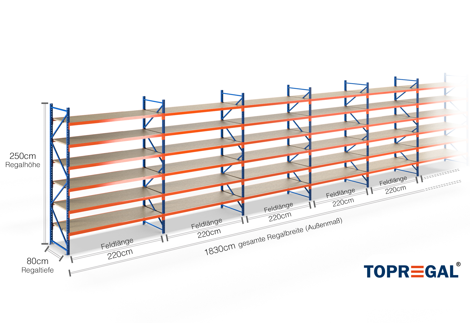 Toutes les données se réfèrent à des charges uniformément réparties. En cas de chargement, la charge par plateau et la charge par travée ne doivent pas être dépassées. En principe, les directives actuelles sur la sécurité et la santé au travail s'appliquent lors de l'utilisation (Règle DGUV allemande 208-061). TOPREGAL décline toute responsabilité en cas d'accidents/dommages dus à une utilisation non conforme. Notre équipe de conseillers spécialisés répondra à vos questions à ce sujet. Les dimensions indiquées sont approximatives et peuvent varier de quelques centimètres. Contactez-nous si vous avez besoin des dimensions exactes du produit que vous souhaitez acheter.