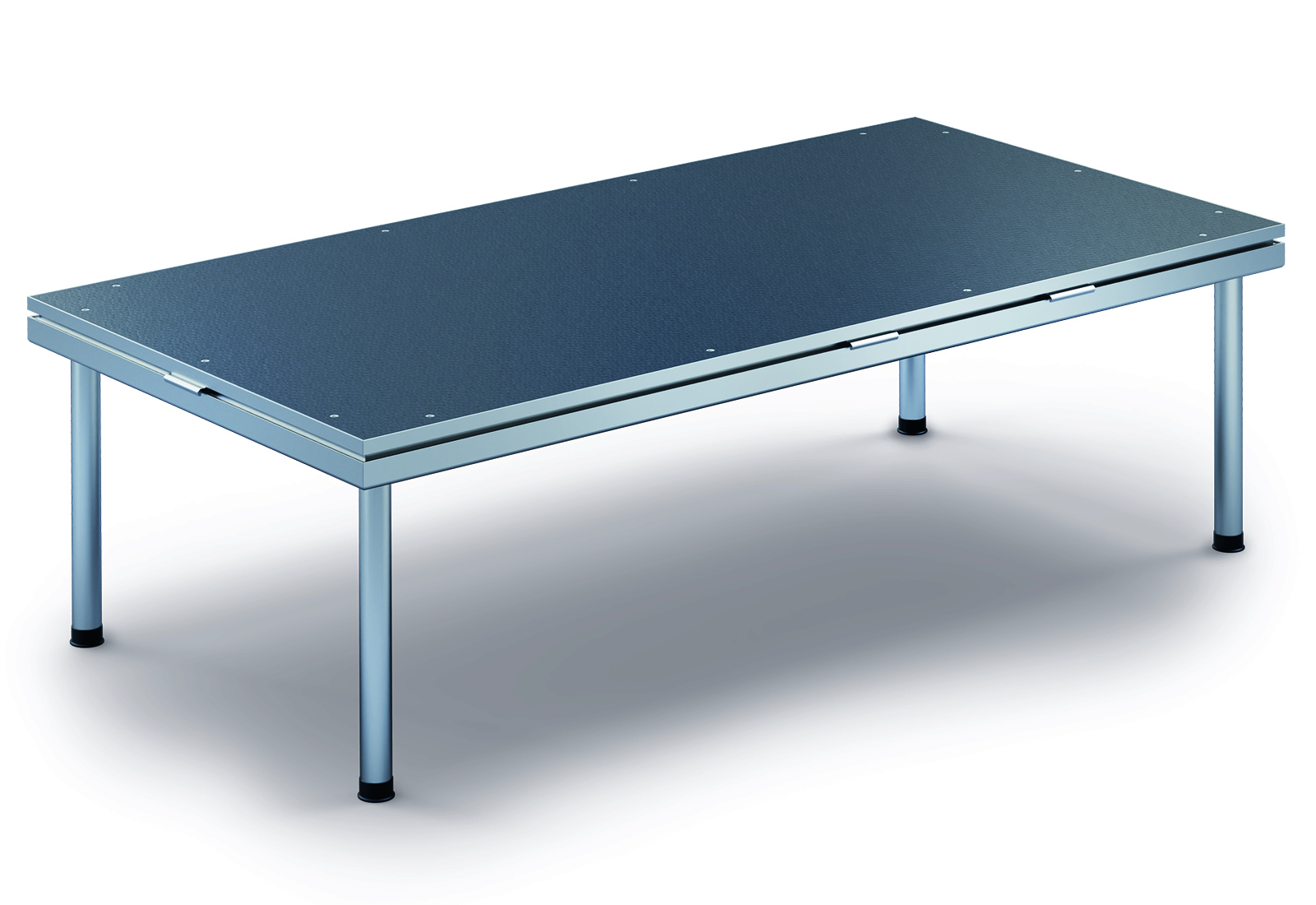 Chaque élément de scène mesure 2.000 mm x 1.000 mm, se compose d'un cadre en aluminium stable de 85 mm de haut et d'un panneau multiplex résistant pouvant supporter une charge maximale de 850 kg. Avec un poids propre de seulement 38 kg par plateau et 0,8 kg par pied, le système est particulièrement maniable et peut être monté sans problème, même par de petites équipes. Il est ainsi possible de créer des surfaces hautes ou basses continues, ainsi que des marches dans la structure de la scène. La scène événementielle modulaire s'adapte ainsi de manière flexible aux conditions sur place et offre de nombreuses possibilités pour des décors sophistiqués.