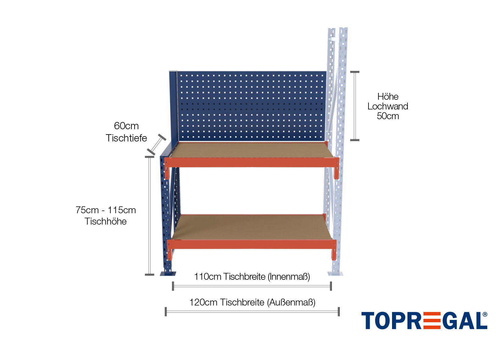 La paroi arrière perforée d’une hauteur de 50 cm est fixée sur le montant arrière et sert de protection contre les chutes. Elle empêche ainsi les marchandises stockées de tomber lorsque la table de travail est un peu trop chargée. La paroi arrière perforée peut aussi être équipée individuellement de nos kits porte-outils. Vous pouvez ainsi ranger astucieusement vos outils et d’autres objets, comme des bacs à bec pour les vis, écrous, rondelles et autres petites pièces.