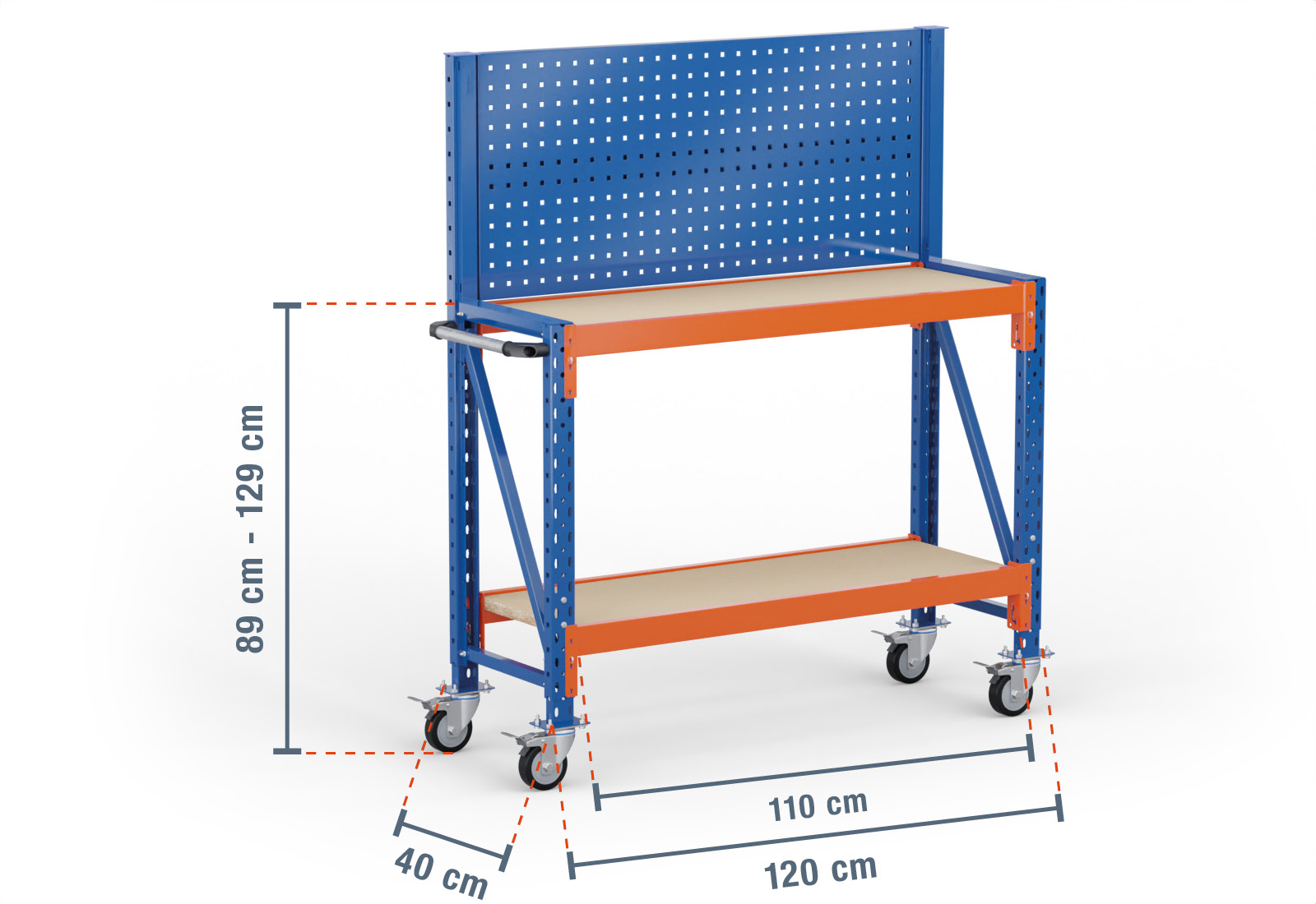 1,2 m table de travail mobile MFW1000-ATF / profondeur 40 cm / hauteur 890 - 1.290 mm / 2 niveaux / platelage Bois / paroi arrière perforée