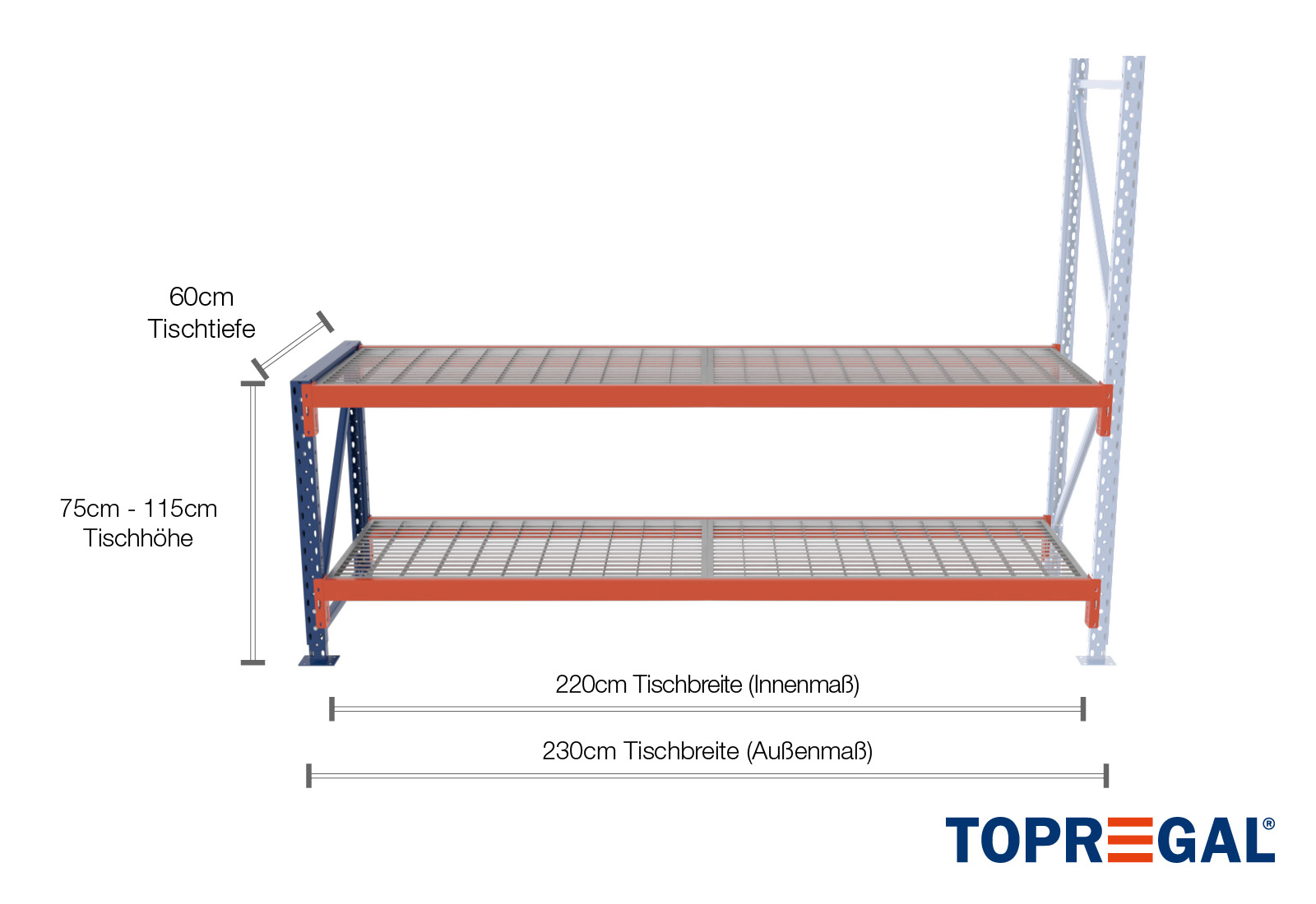 2,3 m table de travail d’extension MFW1000-AT / profondeur 60 cm / hauteur 750 - 1.150 mm / 2 niveaux / platelage Grillage