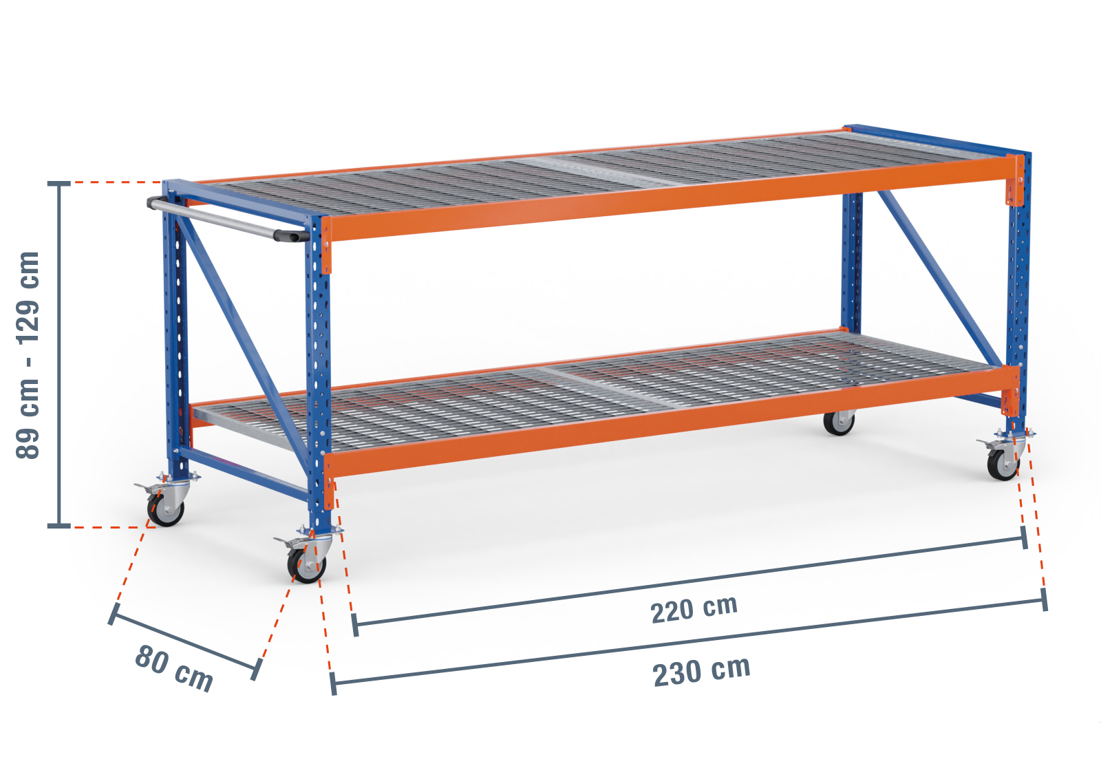 2,3 m table de travail mobile MFW1000-AT / profondeur 80 cm / hauteur 890 - 1.290 mm / 2 niveaux / platelage Grillage