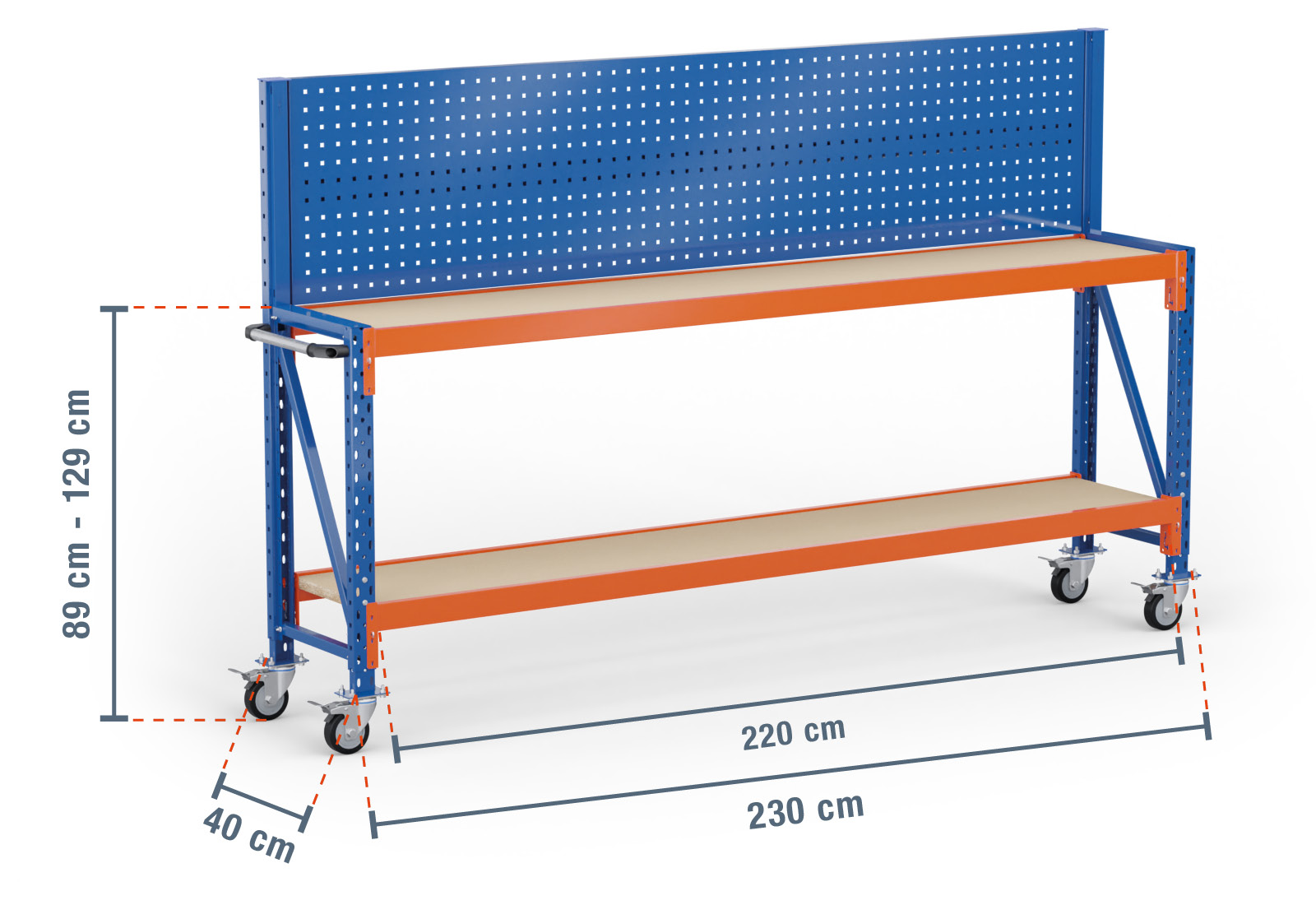 2,3 m table de travail mobile MFW1000-ATF / profondeur 40 cm / hauteur 890 - 1.290 mm / 2 niveaux / platelage Bois / paroi arrière perforée