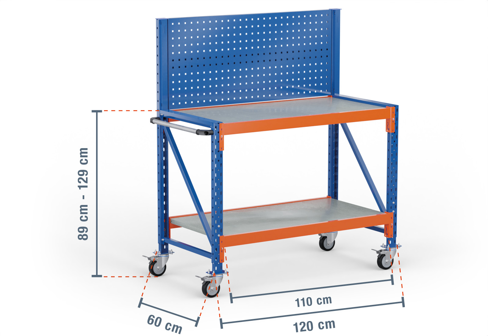 Table de travail mobile 1,2 m MFW1000-AT / profondeur 60 cm / hauteur 890 - 1.290 mm / 2 niveaux / platelage / paroi arrière perforée