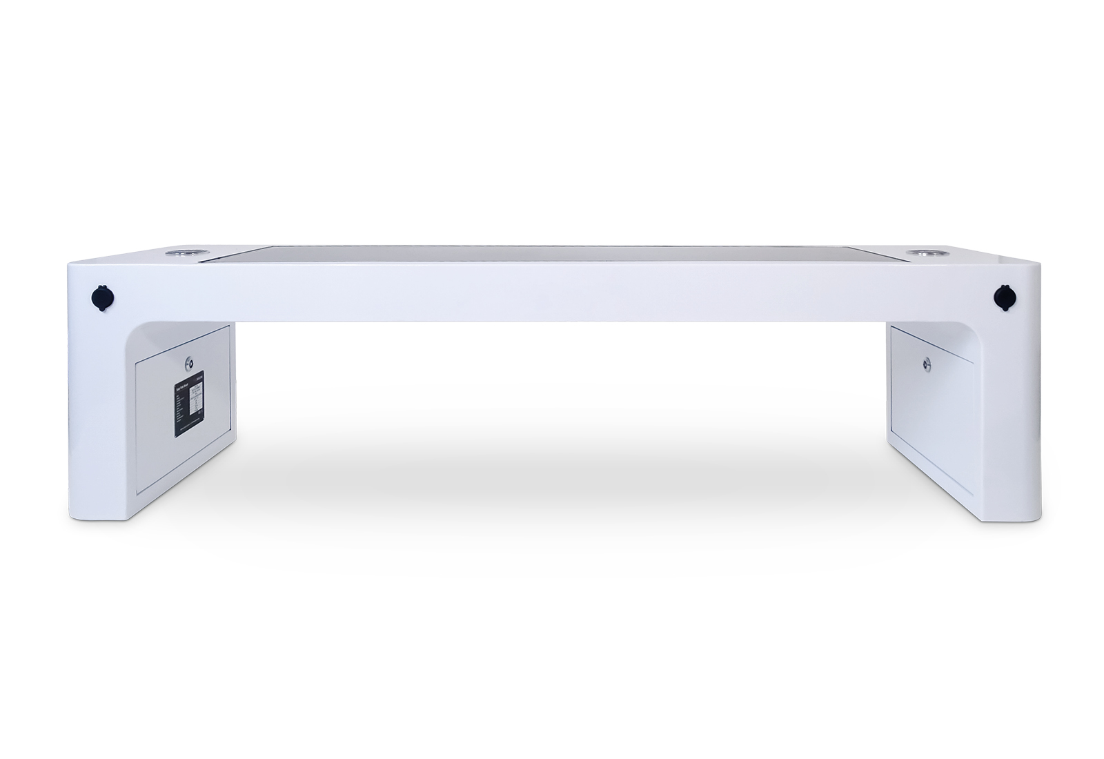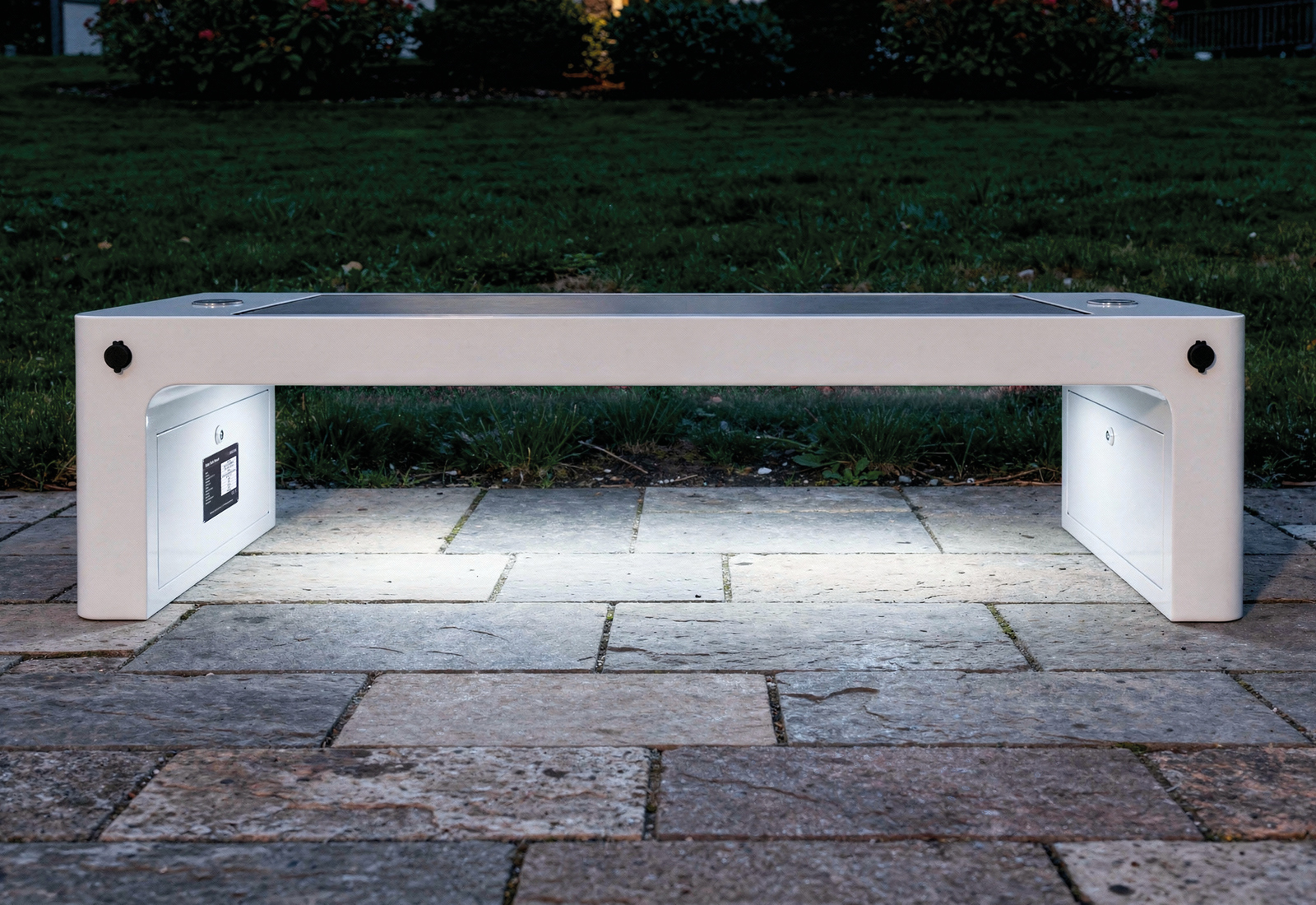 Le panneau solaire 90 W est intégré dans l'assise et possède une surface robuste et résistante aux intempéries. L'énergie est stockée dans une batterie Li-Ion (12 V / 55 Ah). Ainsi, les points de recharge et l'éclairage LED automatique de l'environnement restent fonctionnels même par temps changeant. Les lumières situées sous le banc s'allument automatiquement à la tombée de la nuit et s'éteignent lorsque la luminosité est suffisante. L'éclairage fonctionne avec 12 V, a une puissance de 10 W et une température de couleur d'environ 3.500 K.