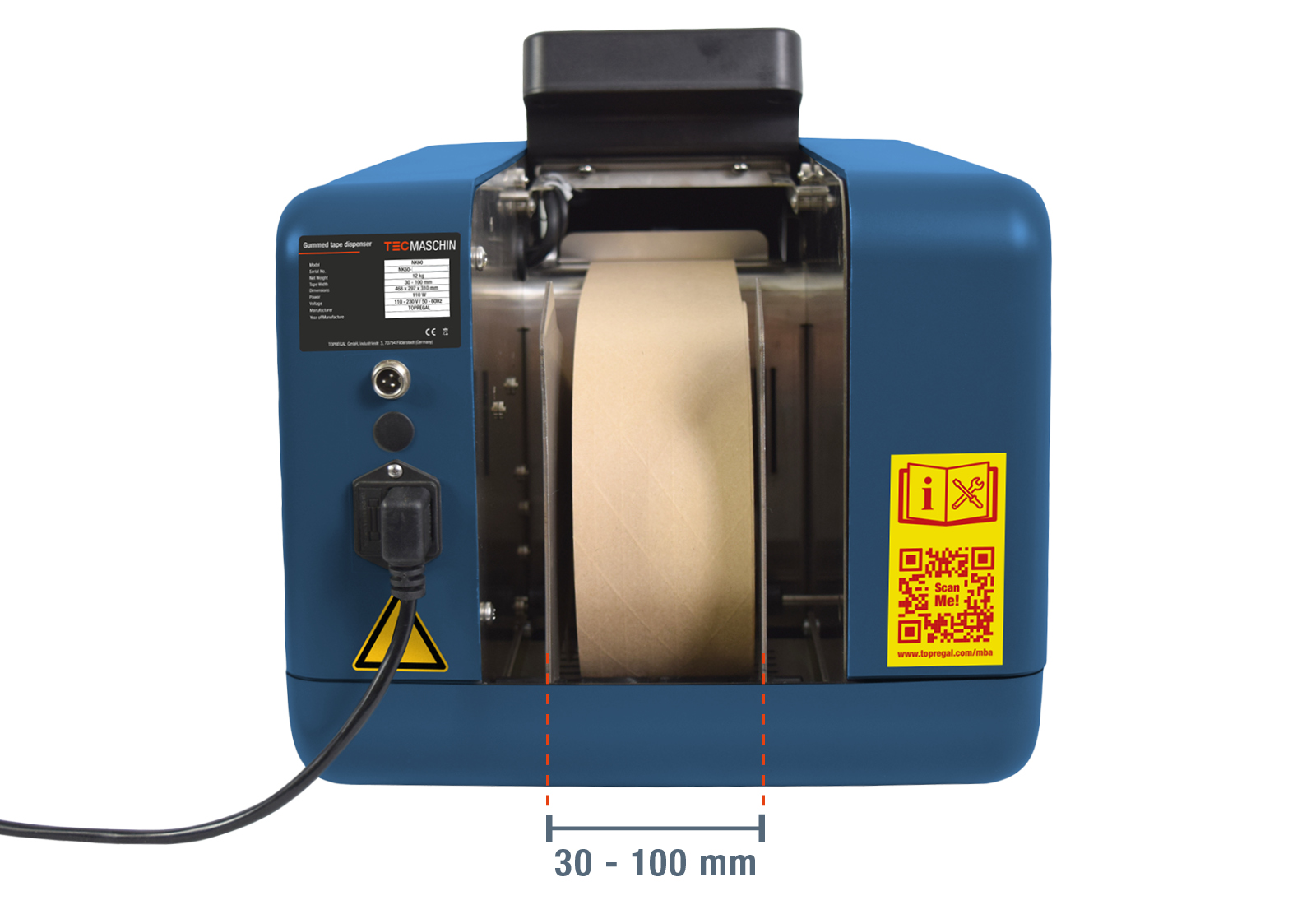• 1 x Kit de collage professionnel : Distributeur de kraft gommé NK60 avec ruban adhésif humide en papier kraft doublement renforcé, largeur 70 mm, TecMaschin