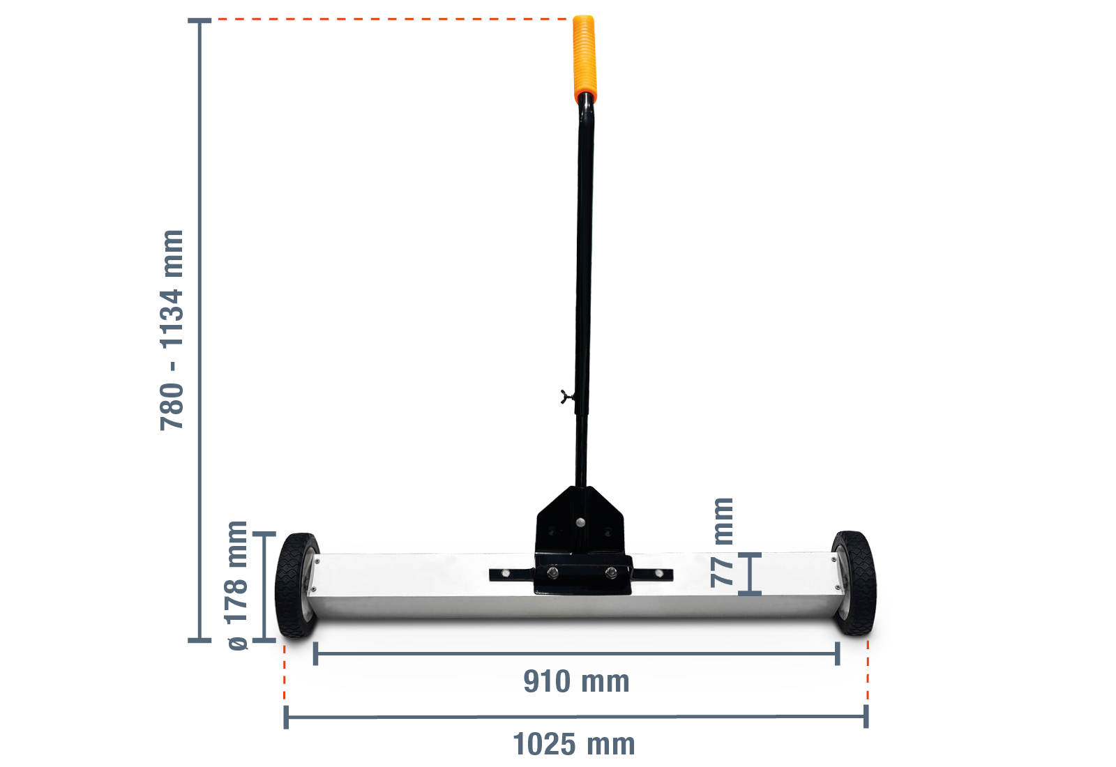 La largeur de travail, roulettes comprises, est de 1.025 mm, le boîtier magnétique lui-même mesure 910 mm. Cela permet de nettoyer rapidement de grandes surfaces sans que le balai ne devienne encombrant dans les espaces restreints. La hauteur du manche télescopique est réglable entre 780 - 1.280 mm et équipée d'une poignée caoutchoutée, ce qui permet à différents utilisateurs de travailler confortablement. De plus, la hauteur des roues peut être ajustée. Cela modifie la distance entre le boîtier magnétique et le sol, et donc la force avec laquelle les pièces métalliques sont attirées.