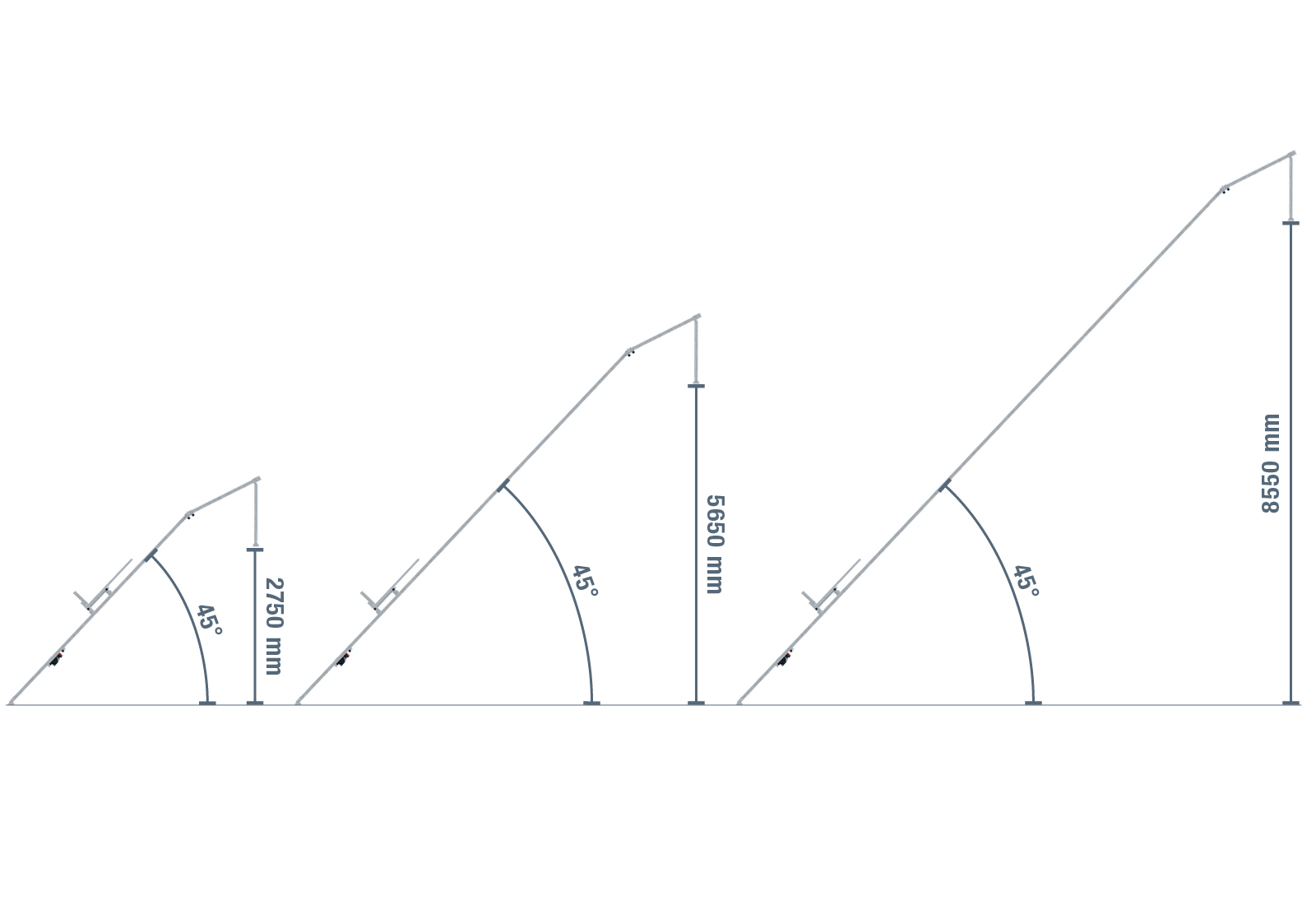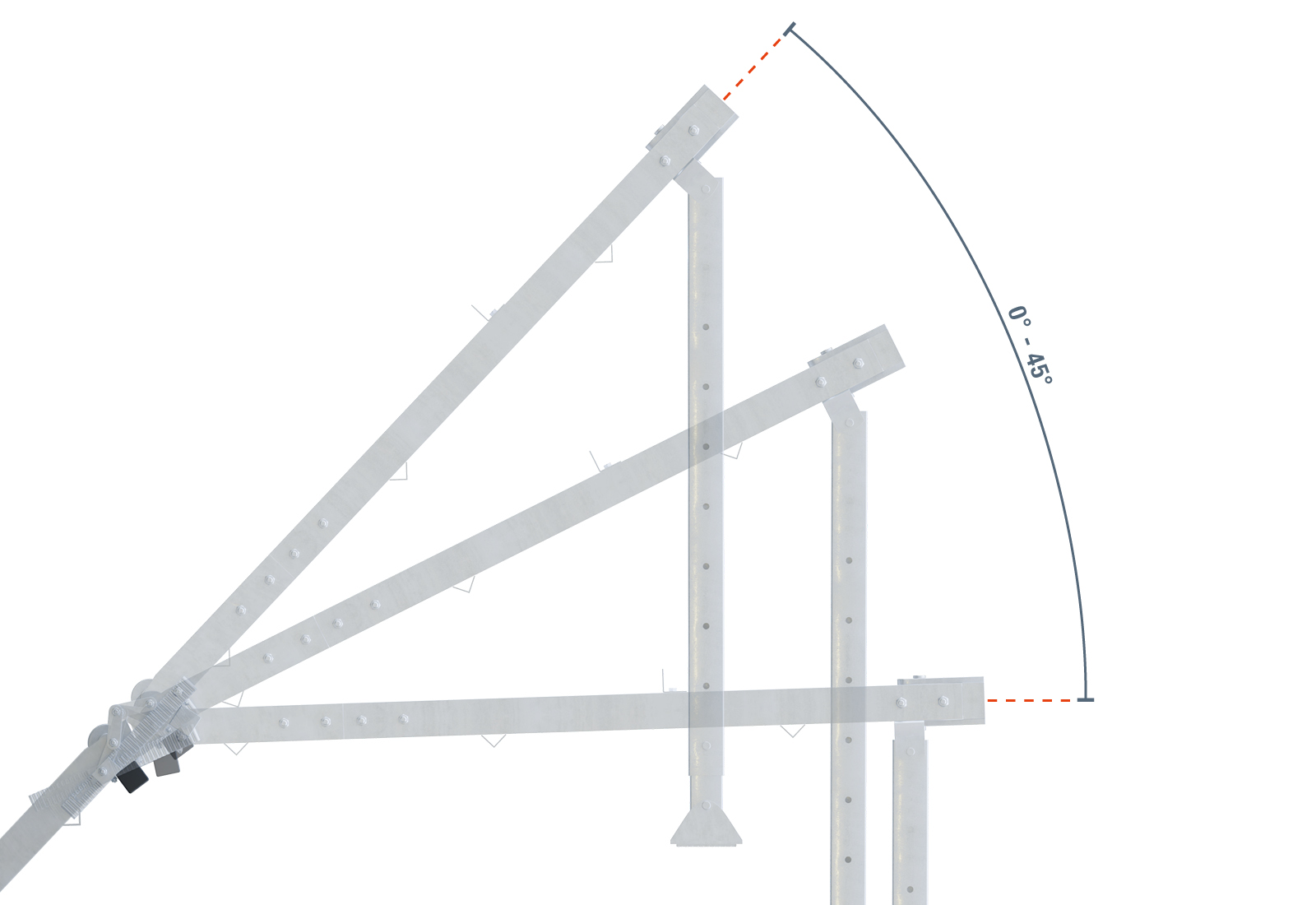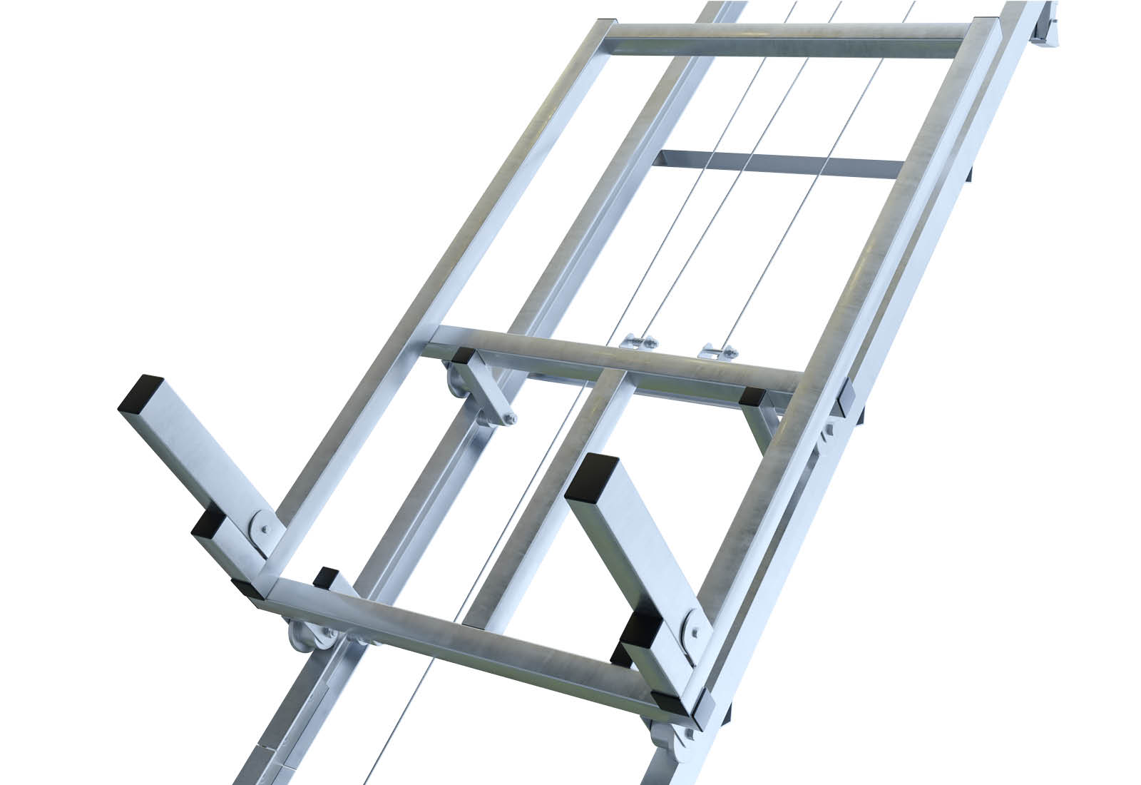 La construction de l'élévateur de toit SolidHub est entièrement modulaire. Elle se compose de cinq modules de rails robustes de 2.000 mm de long, qui sont assemblés de manière stable à l'aide de plaques de connexion vissées. Une barre de soutien supplémentaire assure une stabilité maximale. L'articulation intégrée à l'extrémité supérieure permet un angle d'inclinaison variable de 20° à 40° et s'adapte ainsi de manière flexible aux différentes inclinaisons de toit et aux différents lieux d'utilisation. L'ensemble du système est soutenu par un pied à l'extrémité inférieure, qui se sécurise automatiquement grâce à sa conception intelligente.